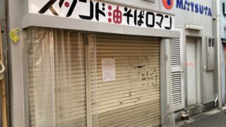 阪急十三駅西口改札出口から徒歩10秒、十三しょんべん横丁にあった立ち食いスタイルの油そば専門店「スタンド油そばロマン 十三店」さんが2026年1月31日(土)をもって閉店、なんば南口店と店舗統合する形で営業されるということです。