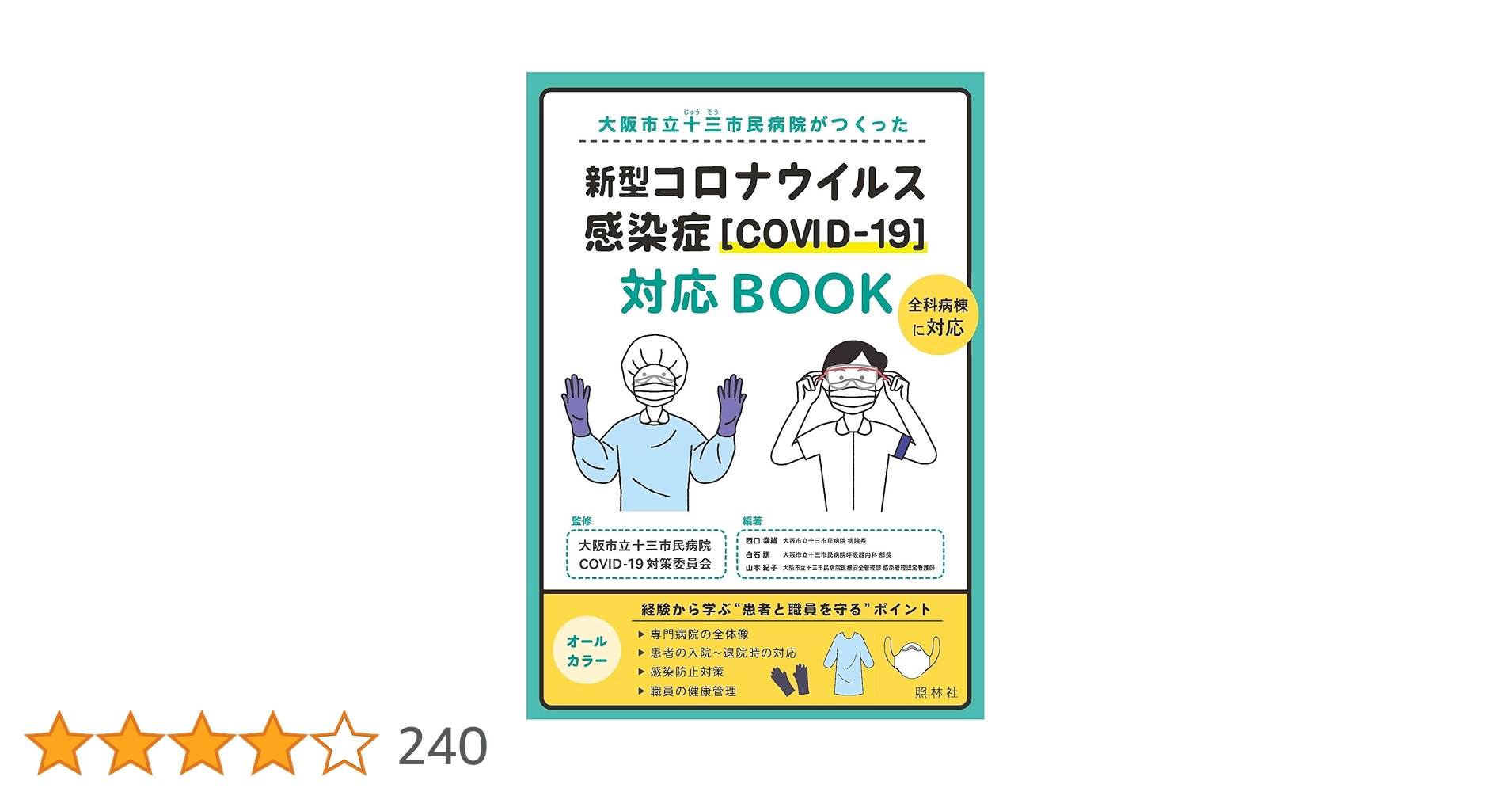 この本の内容ですが、十三市民病院の病院長である西口幸雄氏、呼吸器内科部長の白石 訓氏、感染管理認定看護師の山本紀子氏が今回の新型コロナウイルス感染症の専門病院として運営されていた病院での実現場での経験を踏まえ、対応マニュアルとしてまとめた内容となっています。