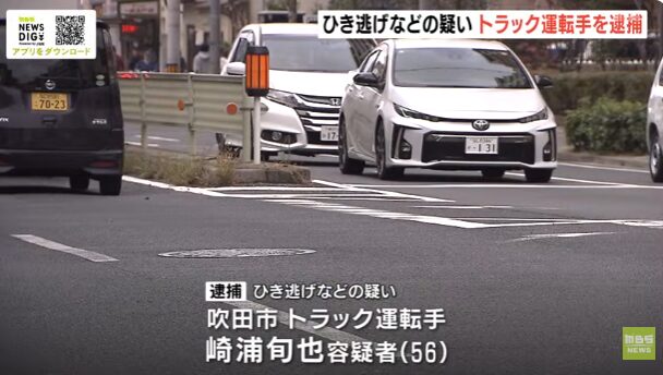 大阪府吹田市山田東のトラック運転手、崎浦旬也容疑者(56)が逮捕されたとのこと。同乗者が1人いたといい、警察では詳しい状況を調べているそうです。