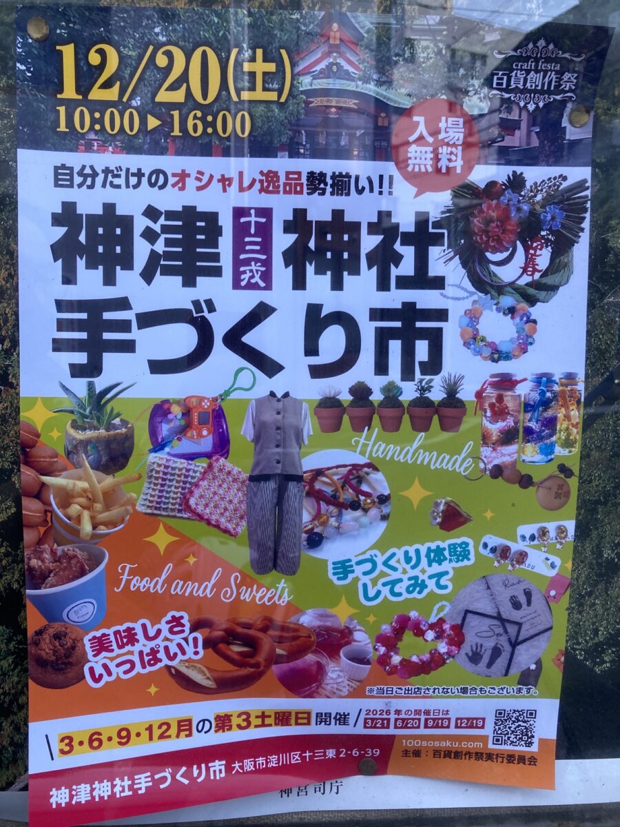 2025年12月20日(土)、阪急十三駅から徒歩3分の神津神社にて、2025年としては4回目、今年最後の開催となるクラフトフェスタ「神津神社手づくり市(百貨創作祭)」が開催されます!