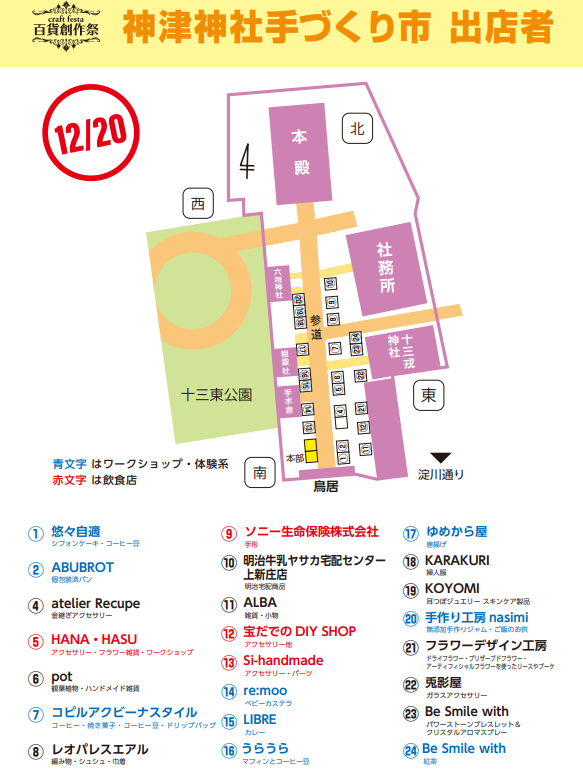 個人作家によるハンドメイド雑貨や、アクセサリー制作等のワークショップ体験が好きな方にはどんぴしゃストライク!阪急十三駅から徒歩約3分程度と、駅近くでアクセスも便利な入場無料イベントになっていますので、2025年12月20日(土)、当日お時間のある方は是非お散歩がてら「神津神社手づくり市(Craft festa百貨創作祭)」のほうへ足を運んでみてはいかがでしょうか!?