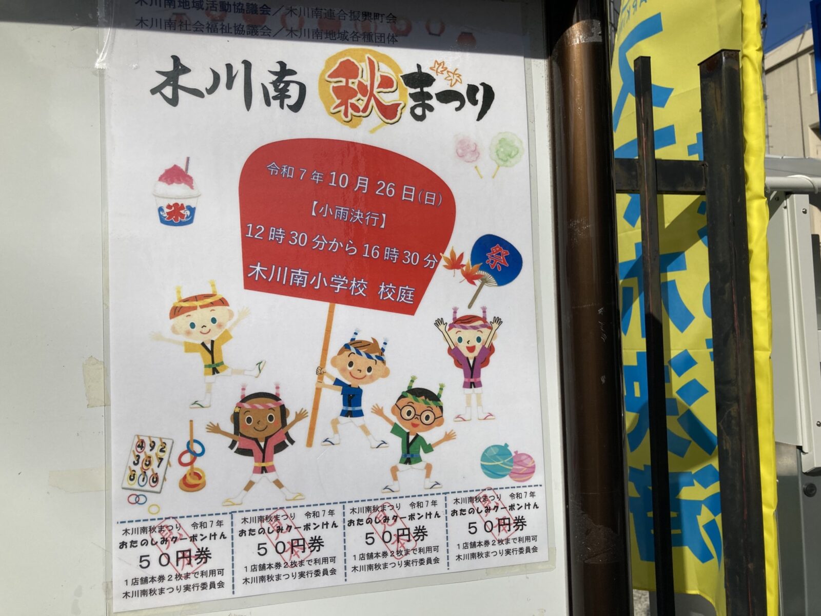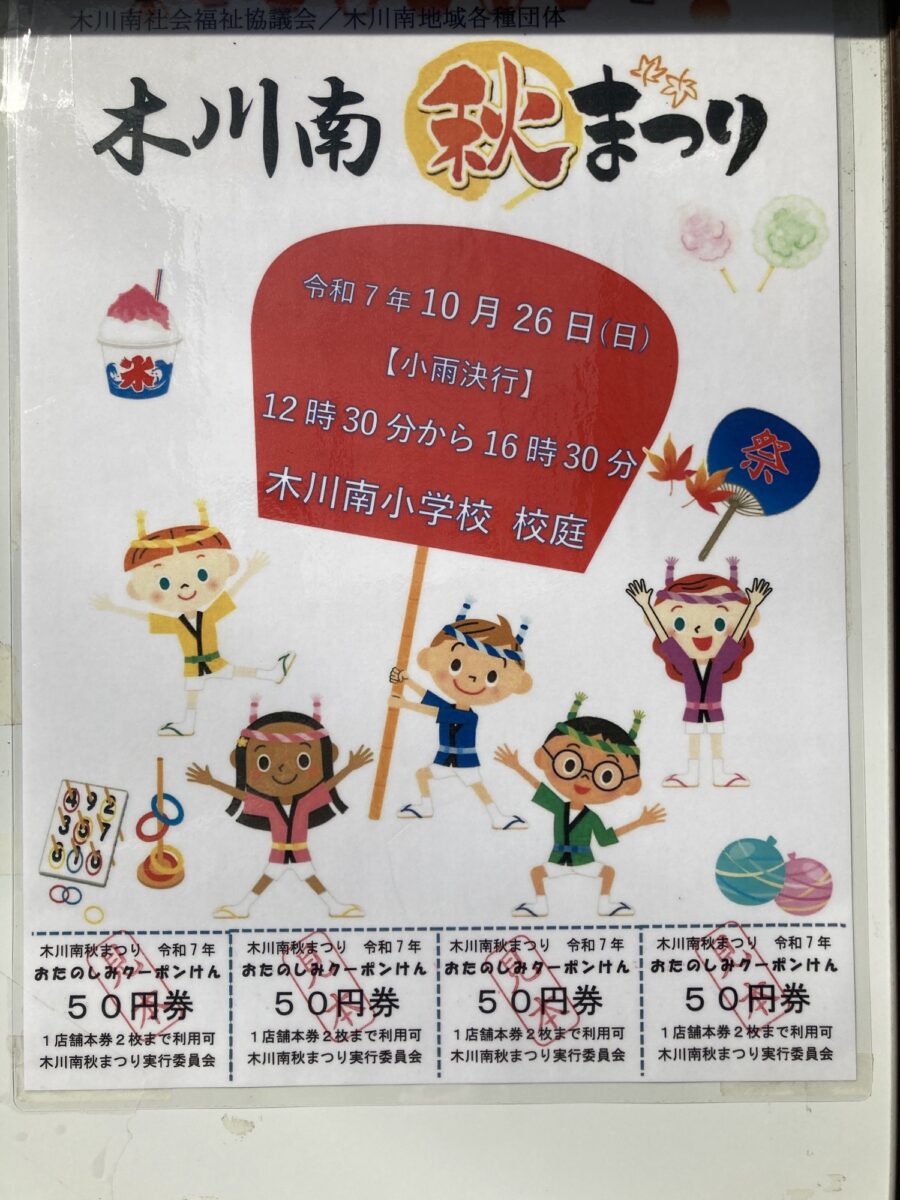 2025年10月26日(日)12:30~、木川東1丁目にある木川南小学校の校庭にて「木川南 秋まつり」が開催予定となっています!
