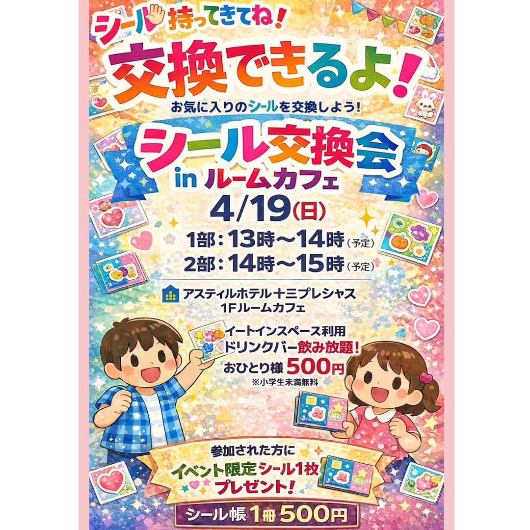 お気に入りのシールを持ち寄って、お友達とシールが交換できちゃうというこちらのイベント。会場は「アスティルホテル十三プレシャス」さんの1階にあるカフェスペースで開催され、参加記念としてイベント限定のシールが貰えるのに加え、シール交換会中は、「ルームカフェ」内にあるドリンクバーの飲み放題がついています!(小学生未満のお子様は無料、小学生以上は参加費500円)