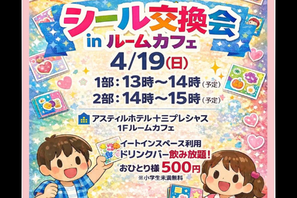 阪急十三駅から徒歩すぐ。アクセス抜群の立地にある人気ホテル「アスティルホテル十三プレシャス」さんで、大好評企画「シール交換会inルームカフェ」が2026年4月19日(日)に開催されます!十三らしい“ゆるさ”と“楽しさ”が詰まった、注目の交流イベントになっていますよ!