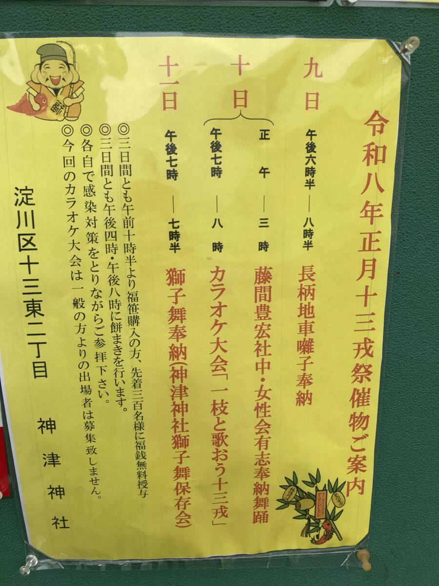 ちなみに神津神社のほうでも「十三戎」が開催される各日3日間、午前10時半より福笹を購入された先着300名様を対象に、縁起物の「福銭」が無料授与されるとのこと。