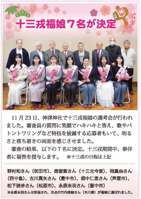 十三戎に従事される福娘に関しても例年通り選抜審査が行われ、今年も審査を勝ち抜いた7名の福娘さんが決定しています。