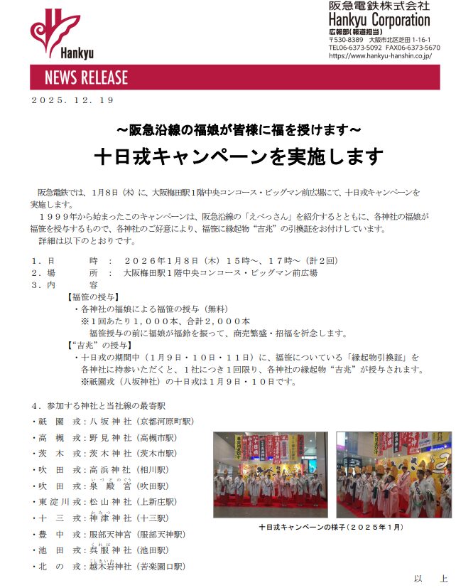 尚、今年も十日戎が始まる前日の1月8日(木)には、大阪梅田駅1階中央コンコース・ビッグマン前広場にて「十日戎キャンペーン」が実施されます。