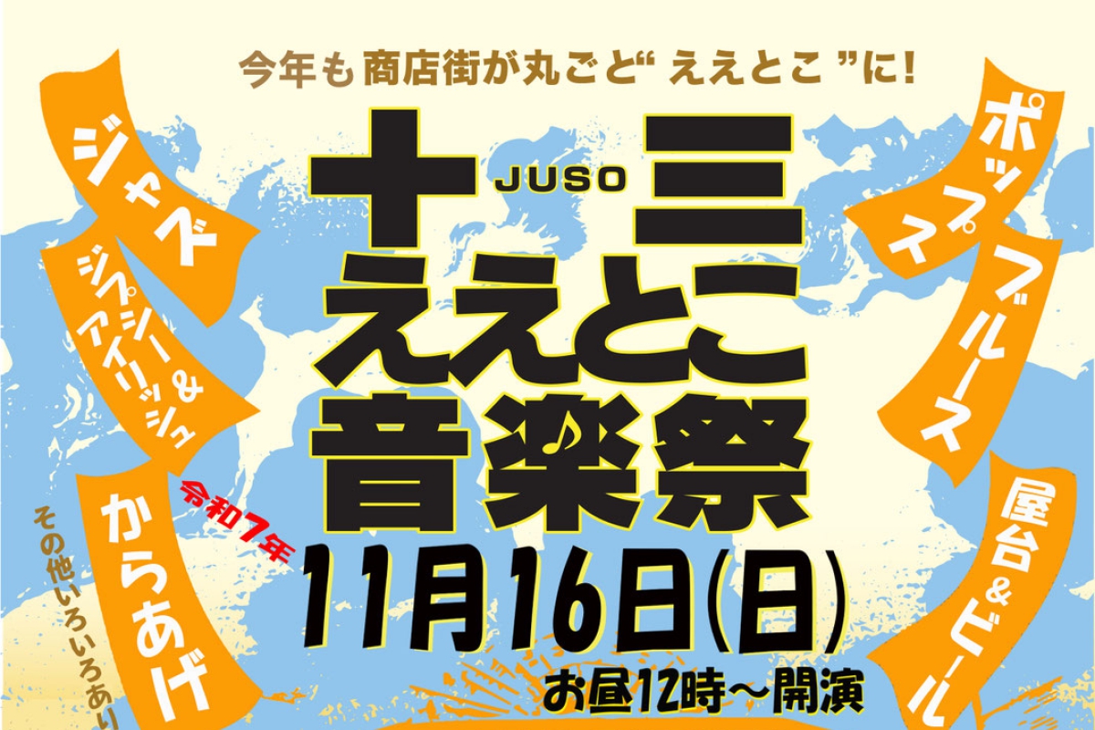 十三エリアを代表する定番の音楽イベント「十三ええとこ音楽祭」。毎年2~3回程、十三のさまざまな場所を舞台として開催されている恒例の人気音楽イベントですが、2025年秋開催は11月16日(日)、十三サカエマチ商店街内、サンポードシティビル1階の軒先特設ステージにて観覧無料イベントとしてお昼の12時より開催予定です!