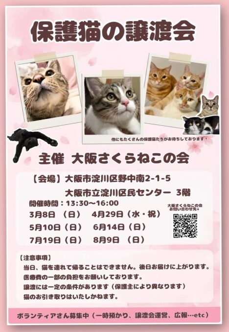 淀川区野中南2丁目にある淀川区民センターで、「大阪さくらねこの会」さん主催による「保護猫の譲渡会」が2026年3月~8月の期間、毎月1回開催されるようです!