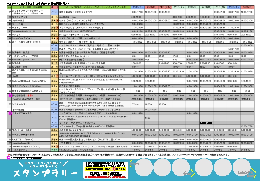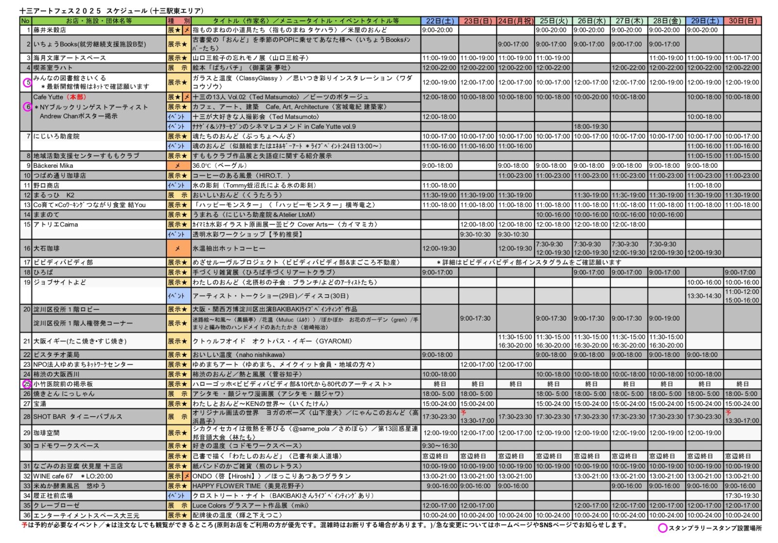 各参加店舗会場やイベント内容を網羅したフライヤーは勿論、各会場毎のアート作品の閲覧可能な時間や条件、日程等が細かくリスト化されたスケジュール表が公開されていますので、こちらもチェックしていただき、興味のある作品やイベントをチェックしつつ、十三のまちを効率よく巡回してただければと思います!