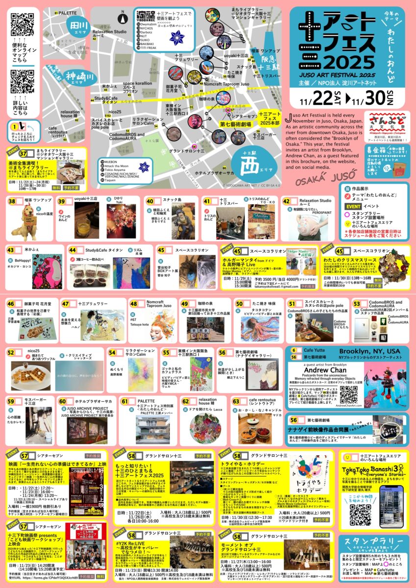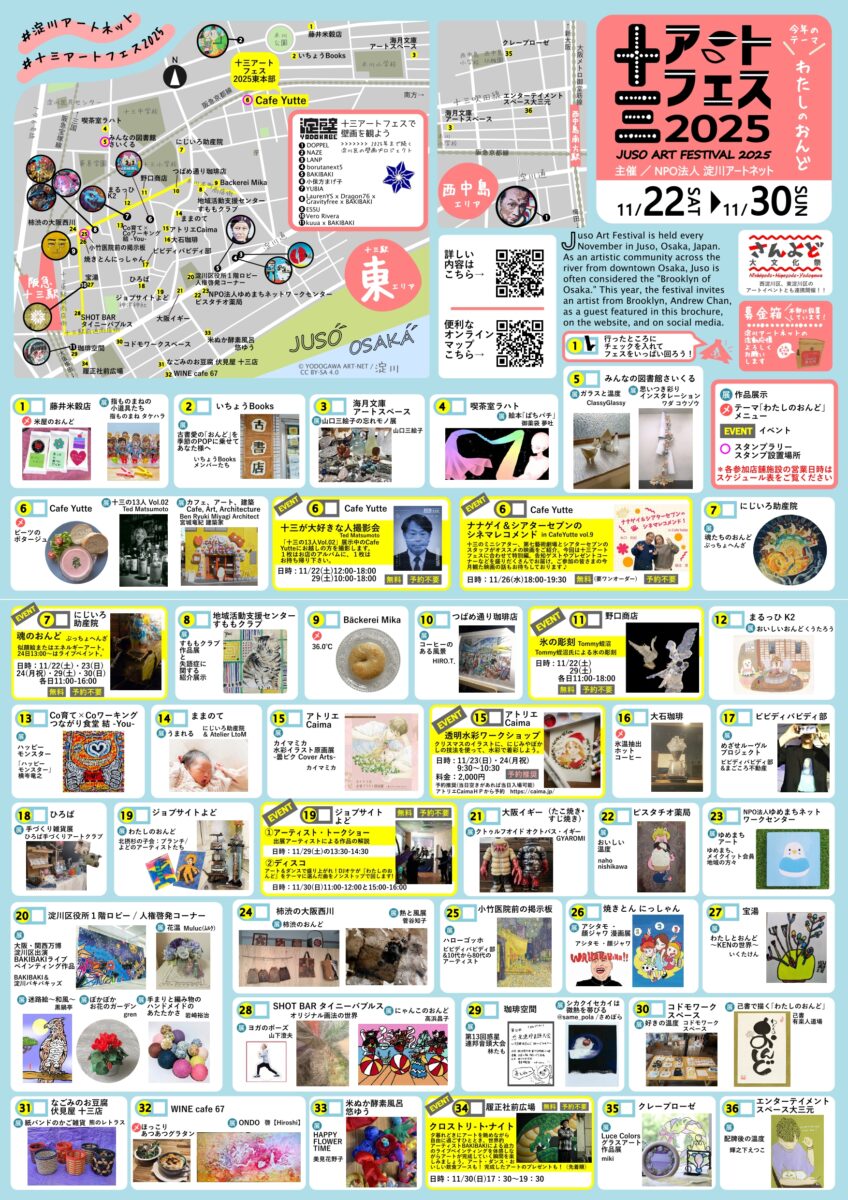 掲載させて頂いたアートフェス情報が情報量モリモリで細かくなっているため、ご覧頂いている端末によっては文字が潰れてみてない場合があるかもしれません(十三エクスプレスではサイトにアップする画像には基本全て自動的に圧縮&軽量化が行われるので、その影響により文字等が潰れてしまう場合があります)。淀川アートネットさんの「十三アートフェス2025」公式サイトのほうでは、原版のフルサイズPDFデータもアップされていますので、詳細をより精細に確認したいという方は、是非そちらのPDFをゲットしてみてくださいね!