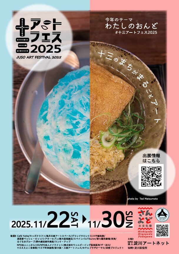 淀川区のアートや文化活動を広める活動されているNPO法人「淀川アートネット」さんが中心となって毎年開催されているアートイベント「十三アートフェス」が今年も開催されます!今年は2025年11月22日(土)~30日(日)の9日間開催となっています!