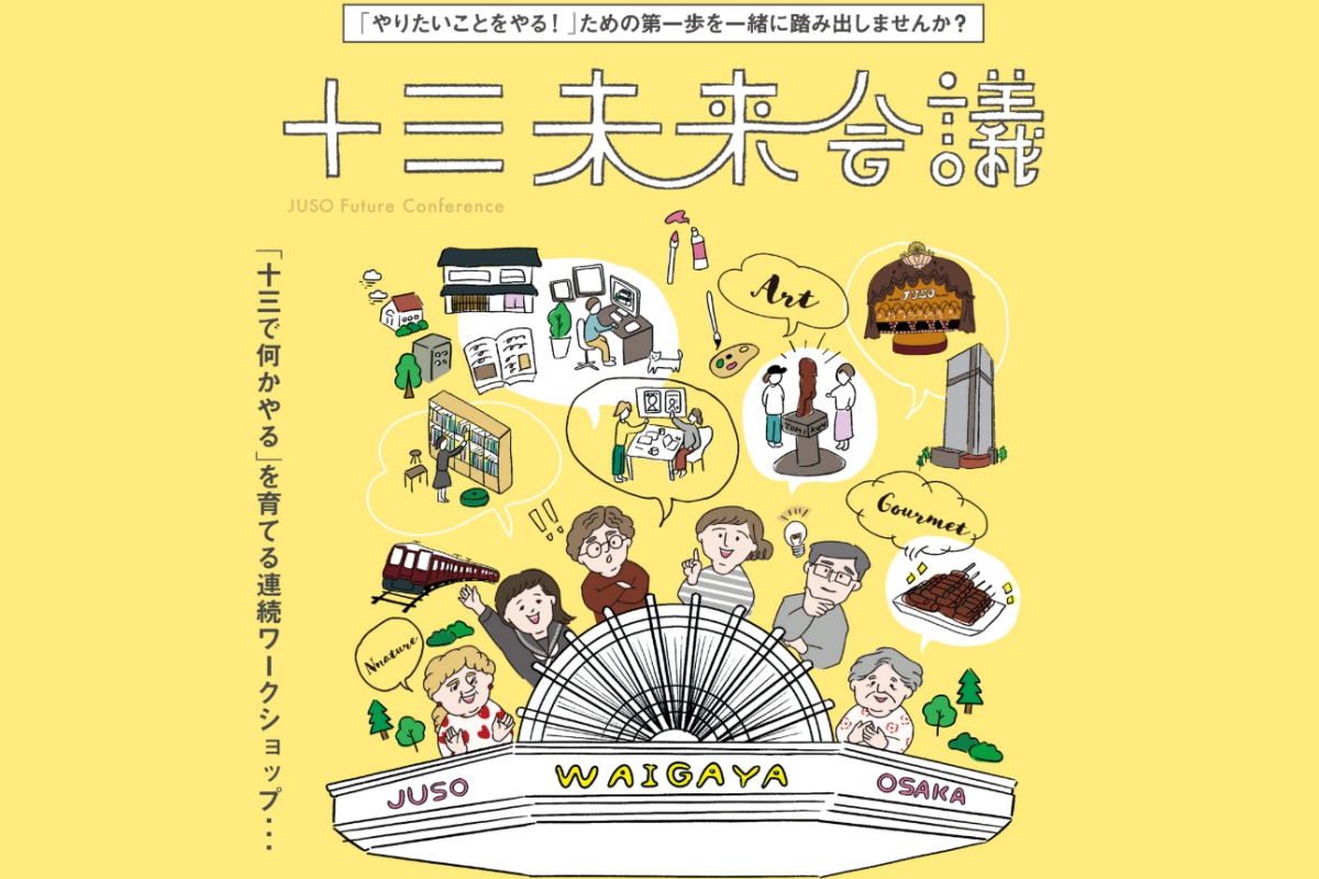 「(株)ウェルビーイング阪急阪神」さん&「公益財団法人都市活力研究所」さんが主催となり、わいがや図書館を拠点に、十三の未来を考え、自発的に新たな活動を生み出すことを目的とした「十三未来会議(じゅうそうみらいかいぎ)」という連続ワークショップを昨年1月より企画開催されてこられました。この取り組みではこれまで延べ200名の方が参加され、その中から約50名が活動づくりに参画。1年間にわたるワークを重ね、7つのチームが組成されています。