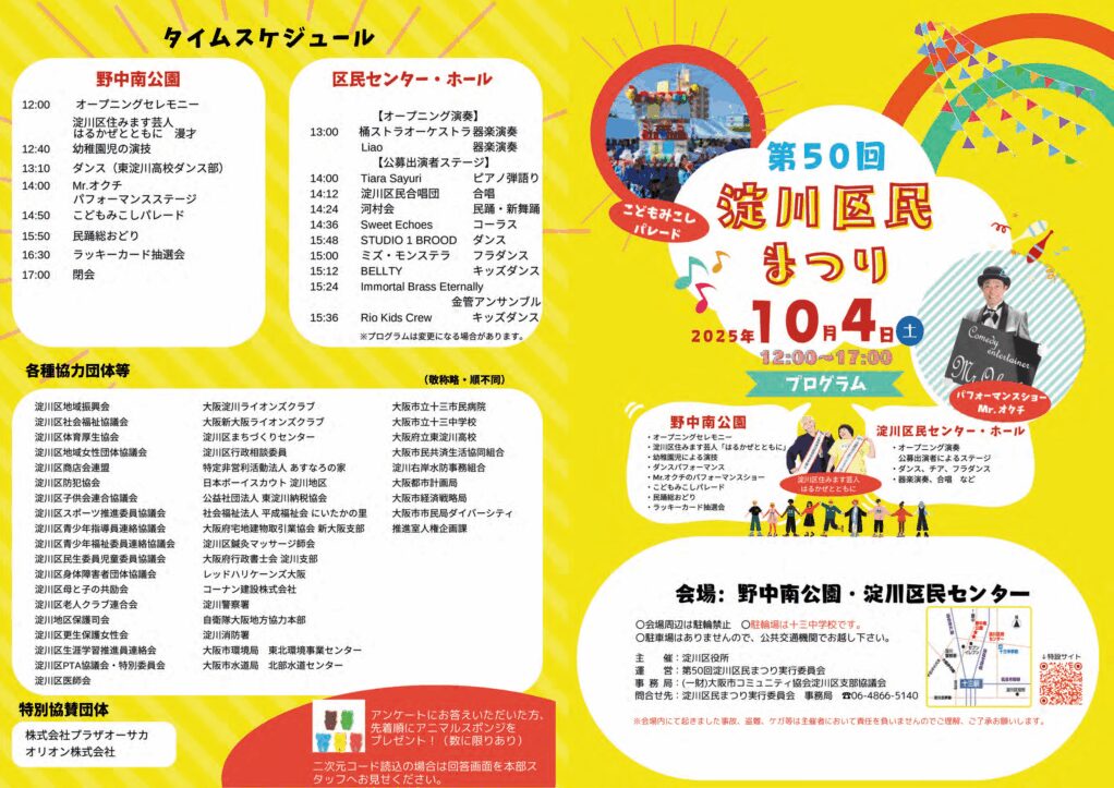 2025年10月4日(土)、今年も夏の終わりの淀川区の恒例行事「淀川区民まつり」が野中南公園&淀川区民センターにて開催されます!今年は淀川区民まつりも第50回という節目となっており、いつも以上?に華やかかつ賑やかな催しとなっているようですよ!