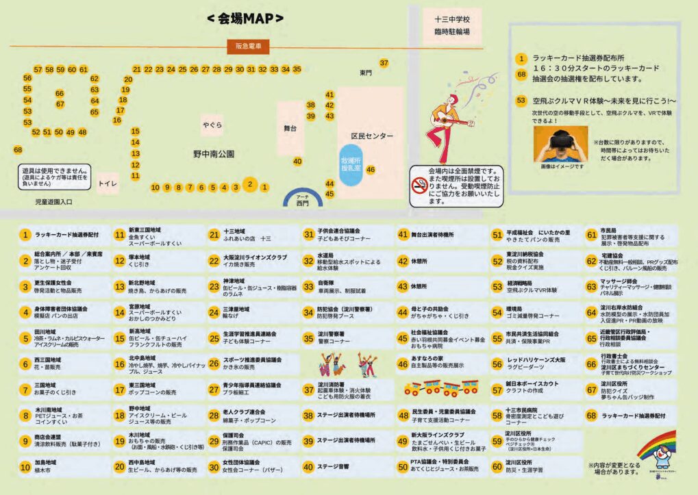 会場は大きく「野中南公園エリア」と「淀川区民センターホール」の2エリアに分けられ、それぞれのステージを中心に様々なブースの出店や演劇やショーのプログラムが予定されています。