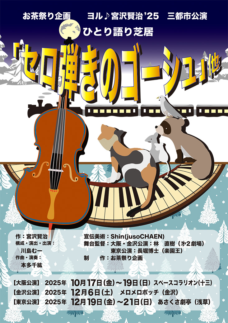 宮沢賢治の詩や短歌、エピソード、お喋りなども交え、物語を戯曲化せずに原文のまま、役者の身一つで語り演じる「お茶祭り企画」さんによる「ひとり語り芝居 ヨル♪宮沢賢治 ’25 「セロ弾きのゴーシュ」の大阪公演が2025年10月17日(金)~19日(日)の3日間、十三元今里2丁目にあるイベントスペース「スペースコラリオン」さんにて公演予定となっています!