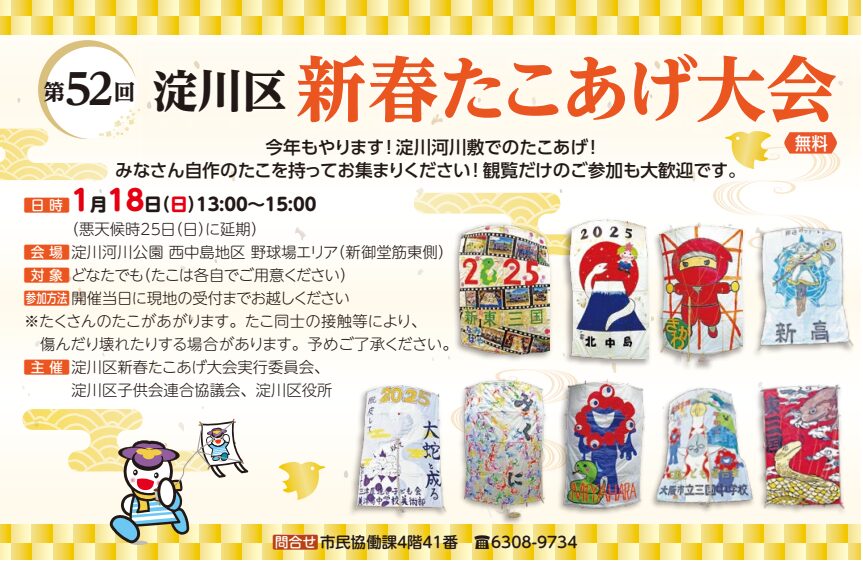 2026年1月18日(日)、淀川区河川公園西中島地区の野球場(新御堂筋東側)にて、新春恒例たこあげイベント「第52回淀川区新春たこあげ大会」が開催予定です!(悪天候時は25日に順延)。