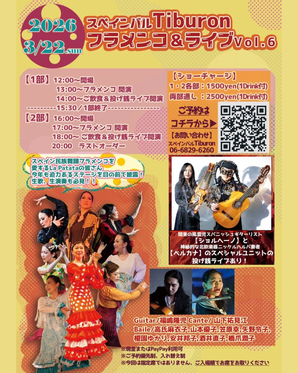 十三本町2丁目、知る人ぞ知る十三の裏スポットエリアにあるスペインバル居酒屋「スペインバルTiburon(ティブロン)」さんにて、6周年を記念した「フラメンコ&ライブVol.6」が2026年3月22日(日)に開催予定です!