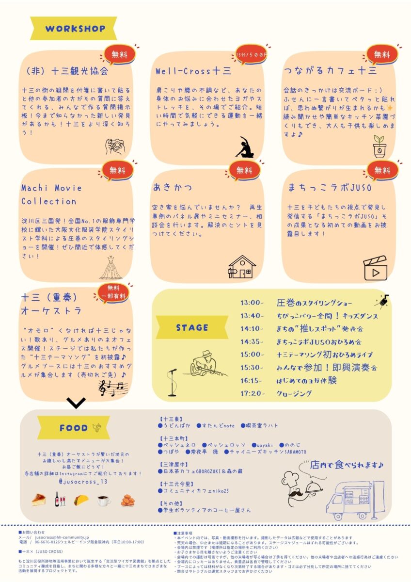 当日は店内で、十三エリアの有名店のメニューが楽しめるフードブースも出現!普段はこういった催しに出店しない様な十三の名店が出店予定なのも要注目です!?ステージプログラムにある「十三テーマソング」も気になるところです!