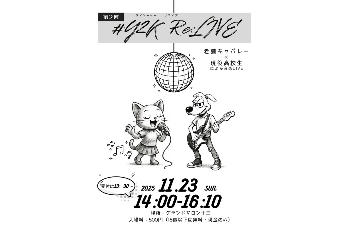 2025年11月23日(日)、十三を代表する現役キャバレー「グランドサロン十三」さんにて、現役高校生達によるライブイベント「#Y2K Re:LIVE」が開催されます!