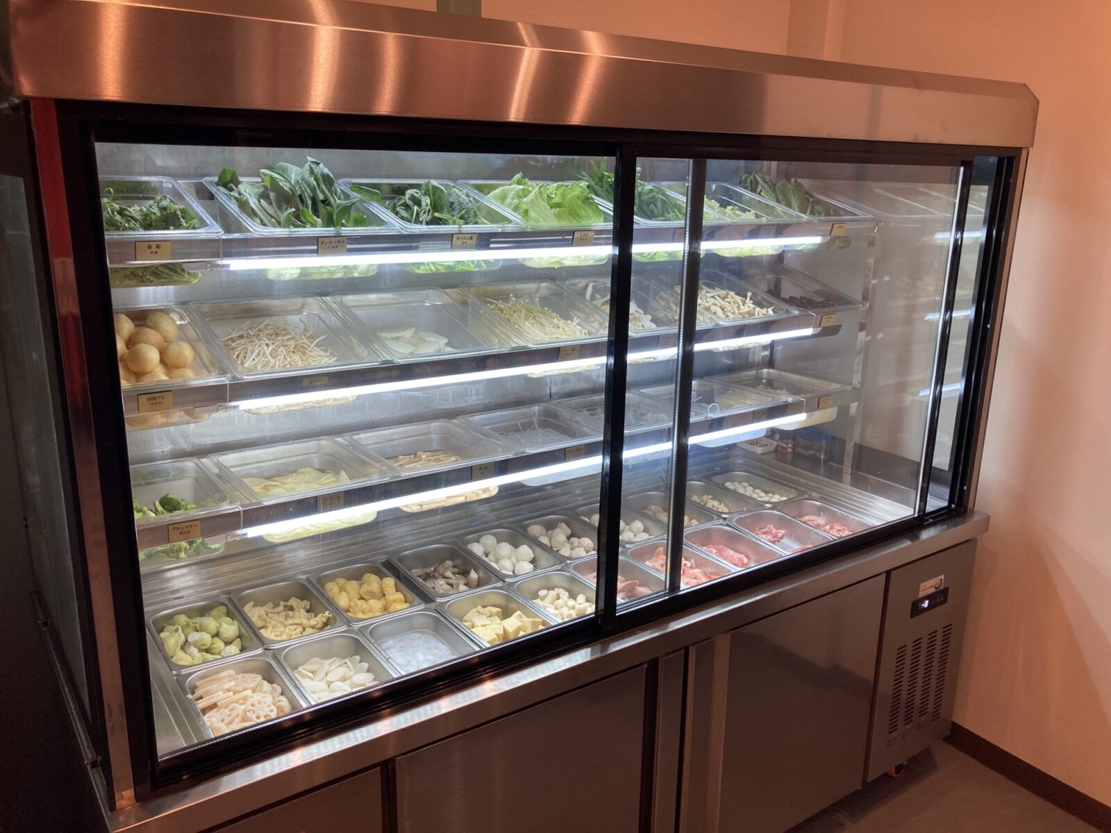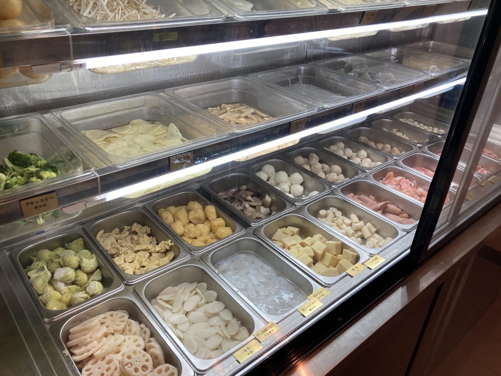 おそらく麻辣湯専門店のシステムとしては、どの店も大体同じだと思うのですが、お店に入るとまず大きなボウルとトングを渡されます。店内には大型のショーケース型冷蔵庫が設置されており、そこに様々な具材がスタンバイ。そこから自分が食べたいお好みの具材を好きなだけ選んでいく…という仕組みになっています。