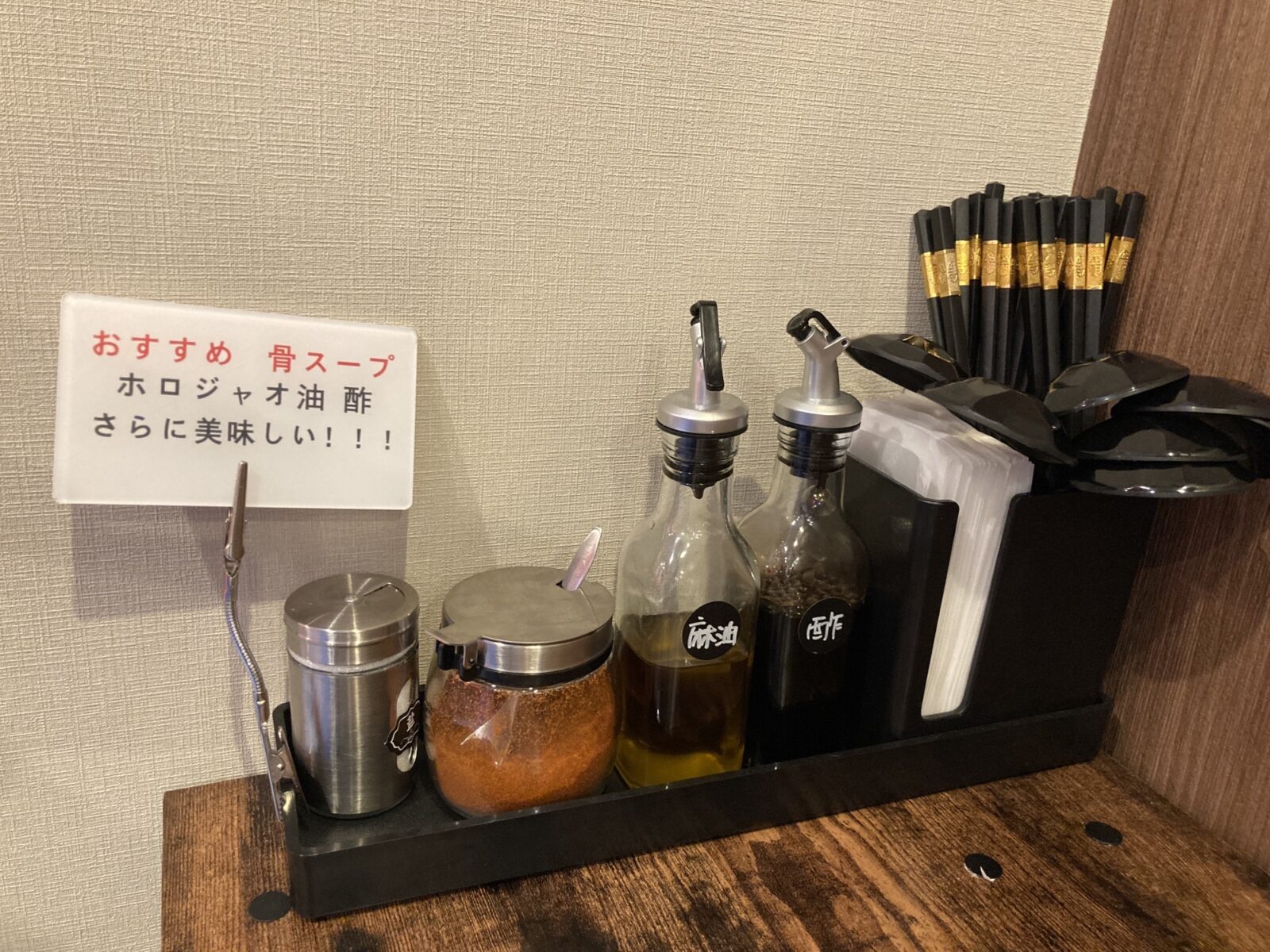 席には唐辛子や麻油、酢(黒酢)なんかがセッティングされているので、これで更に自分流にカスタマイズする事が可能です。