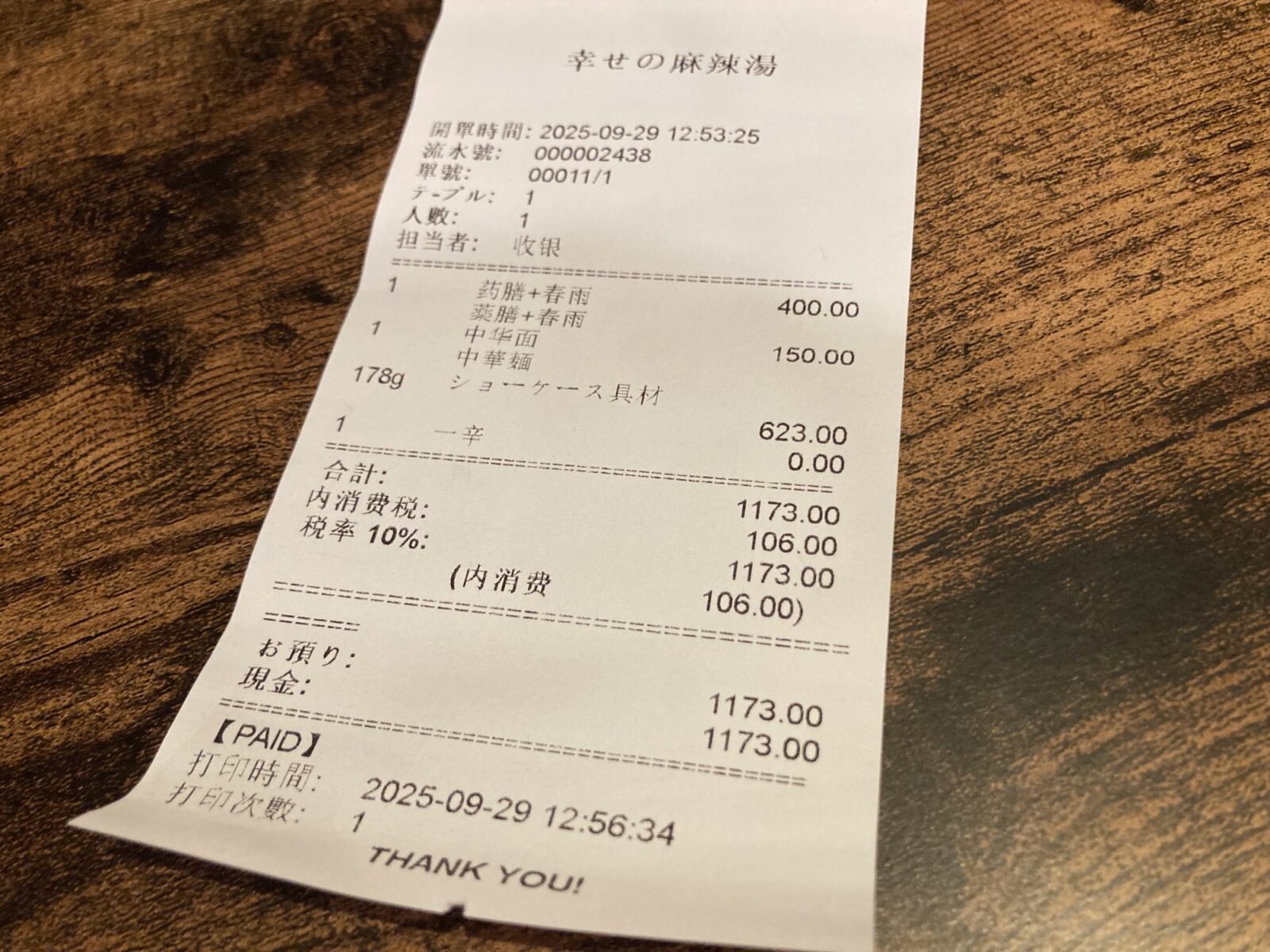 受付カウンターでお会計。今回でいうと「スープ&春雨400円」+「中華麺150円」+「ショーケース具材 178g 623円」でトータル1173円という内容に。高いか安いかわかりませんが、具材の取り具合で結構差が出ちゃうシステムなのではないかと思います!なんにせよ、自分流のカスタマイズが無限大なので、そういったエンタメ性も含めて非常にユニークで楽しいです。