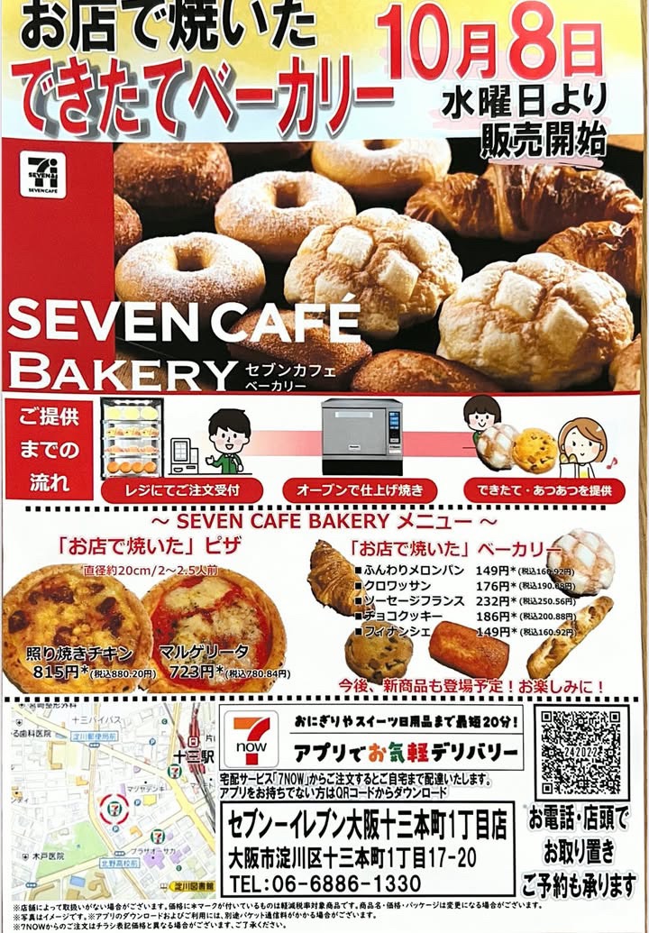 十三本町1丁目にあるコンビニエンスストア「セブンイレブン大阪十三本町一丁目店」さんで、焼きたてパン&ピザの販売「SEVEN CAFE BAKERY(セブンカフェベーカリー)」が2025年10月8日(水)よりスタートします!
