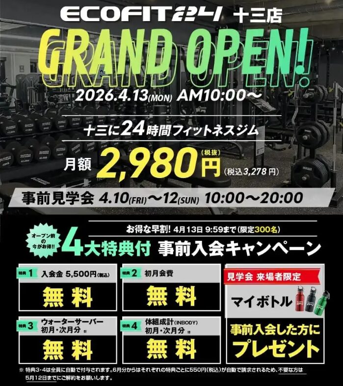 暖かくなってきて、「今年こそは運動を始めなきゃ…」と思っているそこのアナタに超特大の朗報です!十三本町1丁目、十三公園のすぐ近くに、コスパ最強の24時間フィットネスジム「ECOFIT24(エコフィット24)十三店」さんが2026年4月13日(日)に新規オープンします!
