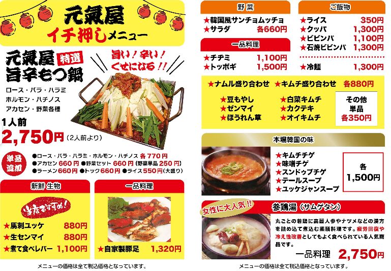 「元氣屋」さんの看板メニューは、店舗名にもある「特選旨辛もつ鍋」!。ロース・バラ・ハラミ・ホルモン・ハチノス・アカセンの上に、たっぷりお野菜を乗せ、鉄板のような鍋で煮込む旨い!辛い!くせになる!というスペシャルなお鍋になっています!