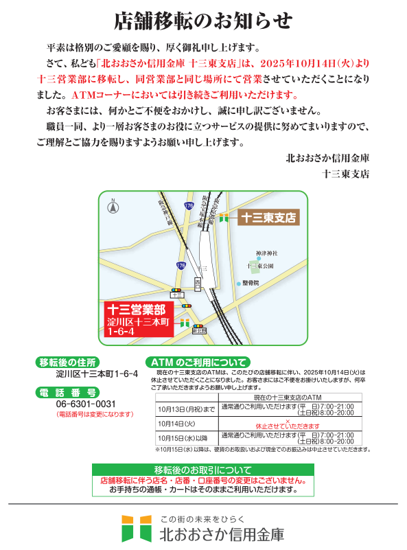 その他銀行サービスを受けたい場合には、十三駅を挟んだ反対側、新北野交差点の「北おおさか信用金庫十三営業部」さんへ足を運ぶ必要があり、少しだけ不便にはなりますが、十三から完全に撤退と言うわけではありませんのでご安心頂ければと思います!