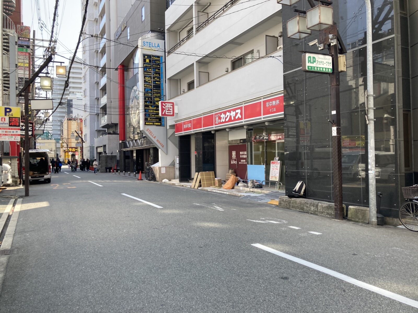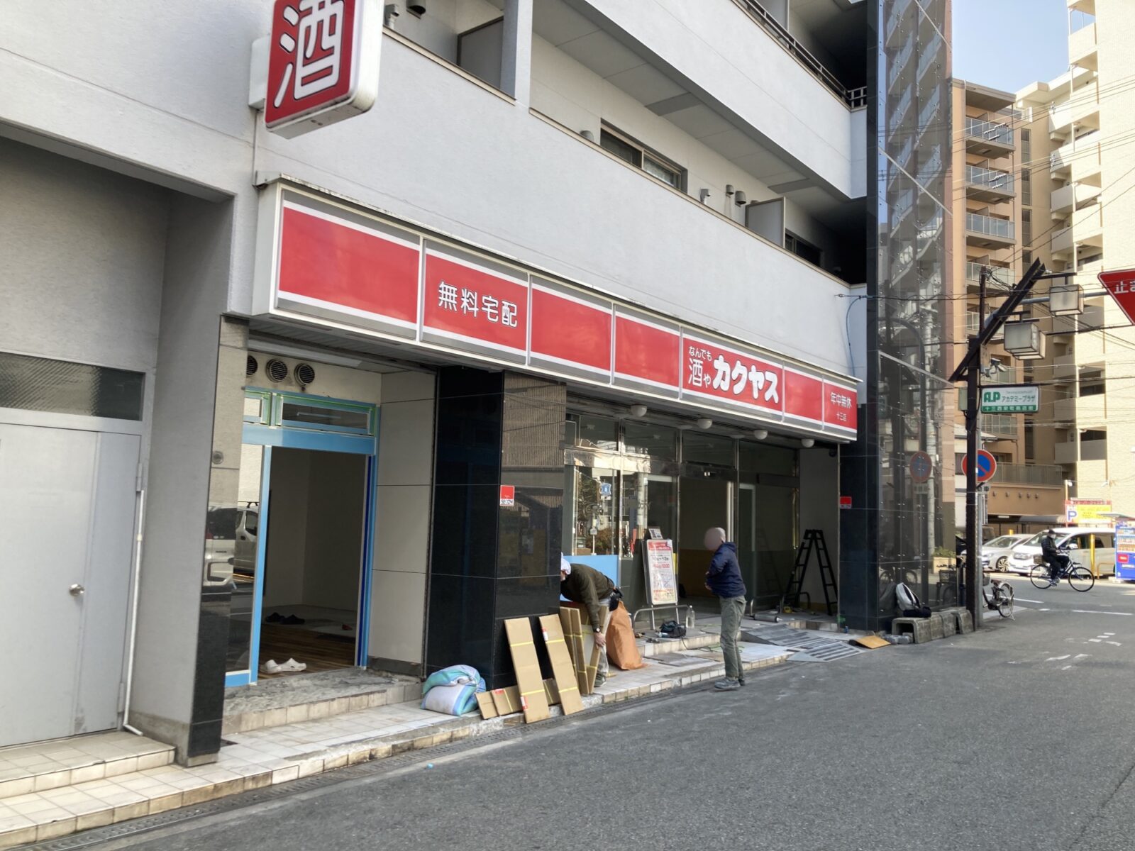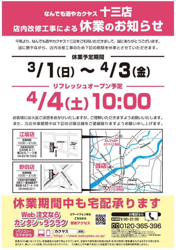 十三本町1丁目、ホテルMinn十三さんの建物1階にある酒屋「なんでも酒やカクヤス 十三店」さんが店内改修工事の為3月1日(日)より休業されています。