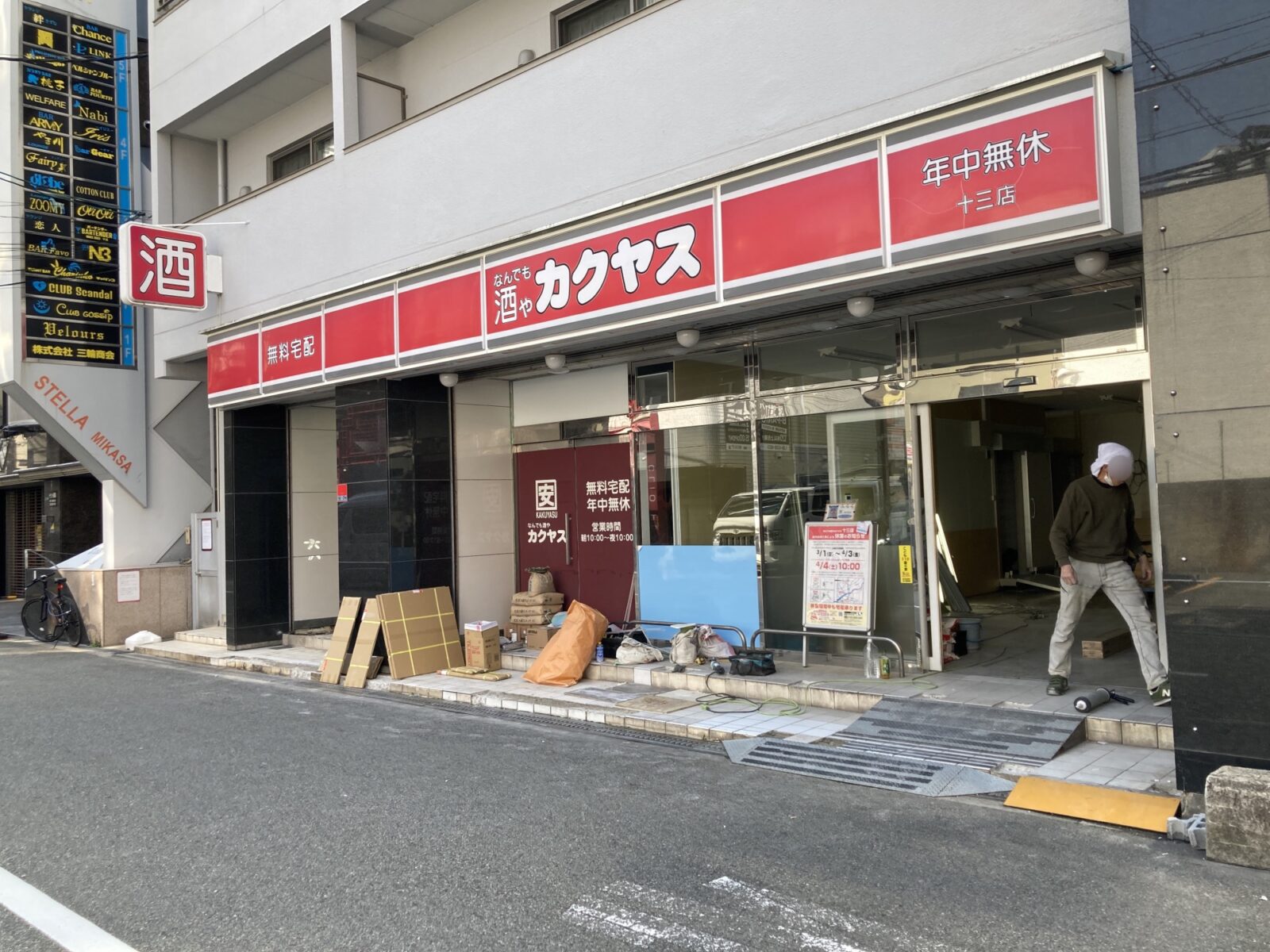 十三本町1丁目、ホテルMinn十三さんの建物1階にある酒屋「なんでも酒やカクヤス 十三店」さんが店内改修工事の為3月1日(日)より休業されています。