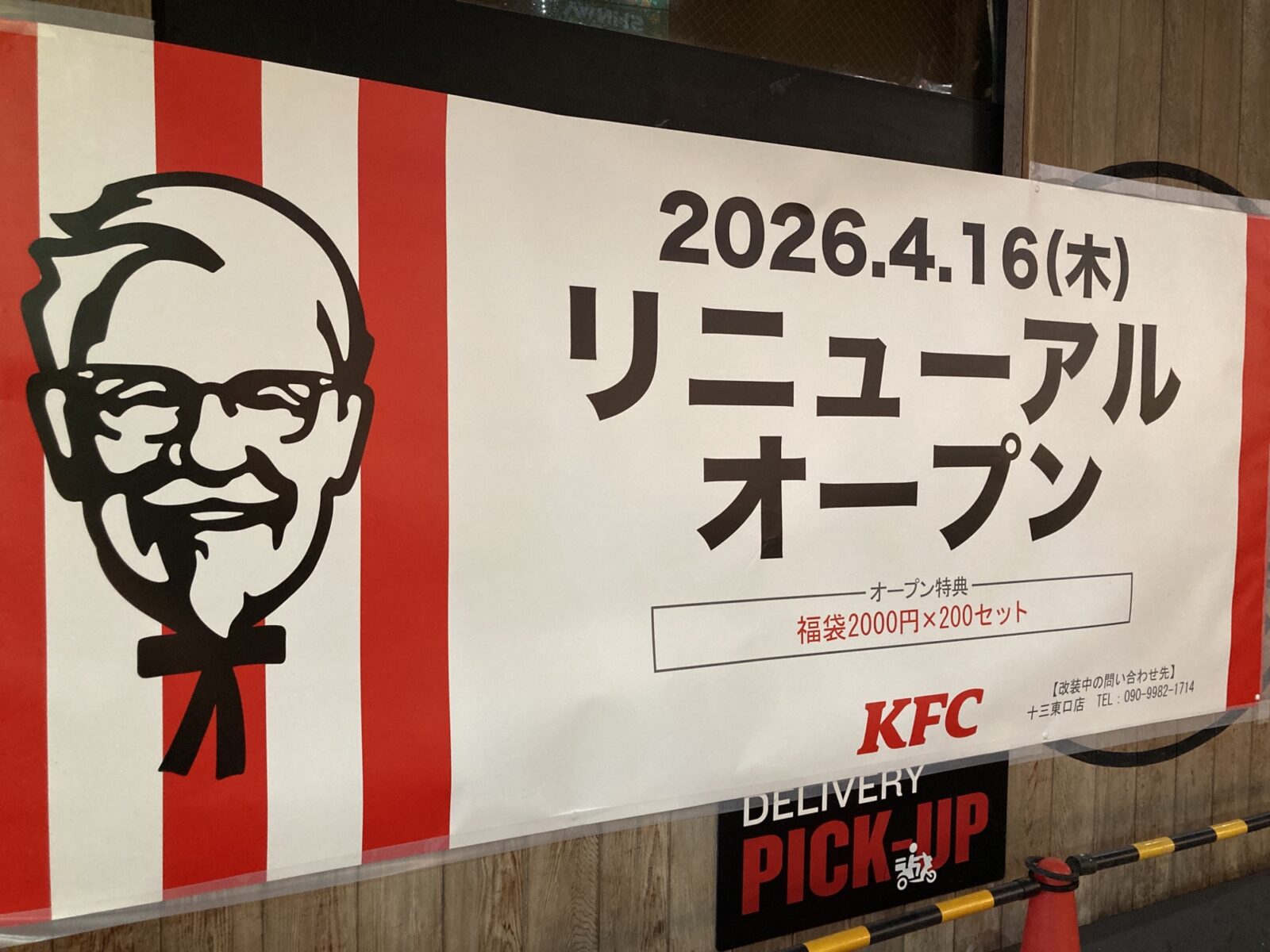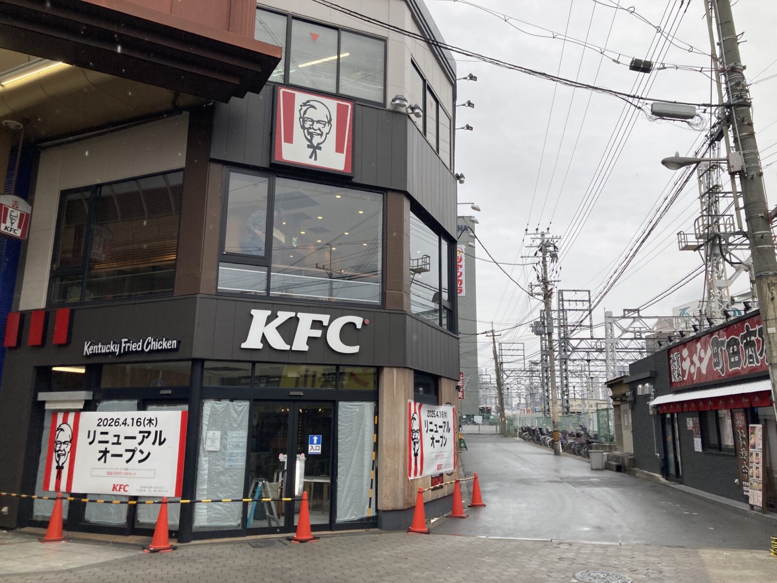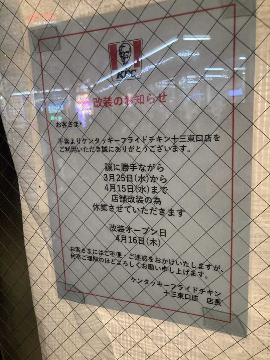 現在、十三駅東口を利用されている方はすでにお気づきかと思いますが、KFC十三東口店は店舗改装のため、以下の期間、一時休業となっています。