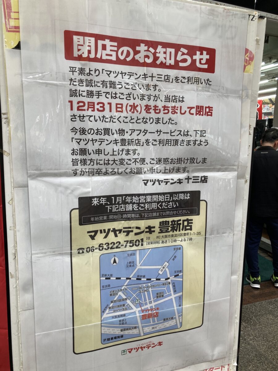 店舗前&公式サイトでは、閉店を告知するアナウンスと、今後のアフターサービスに関しては「マツヤデンキ 豊新店」が引き継ぐ形になることがお知らせされています。「マツヤデンキ 十三店」でお買い物された家電製品等に関するアフターフォローやご相談に関しては、少し離れた店舗にはなりますが、淀川区豊新1丁目にある「マツヤデンキ 豊新店」さんのほうで引き続き対応されます。つまりは現在実施されている閉店セール「大処分市」で何か高価な電化製品を購入した場合においても、アフターフォローはバッチリ対応可能となっていますのでご安心くださいませ!