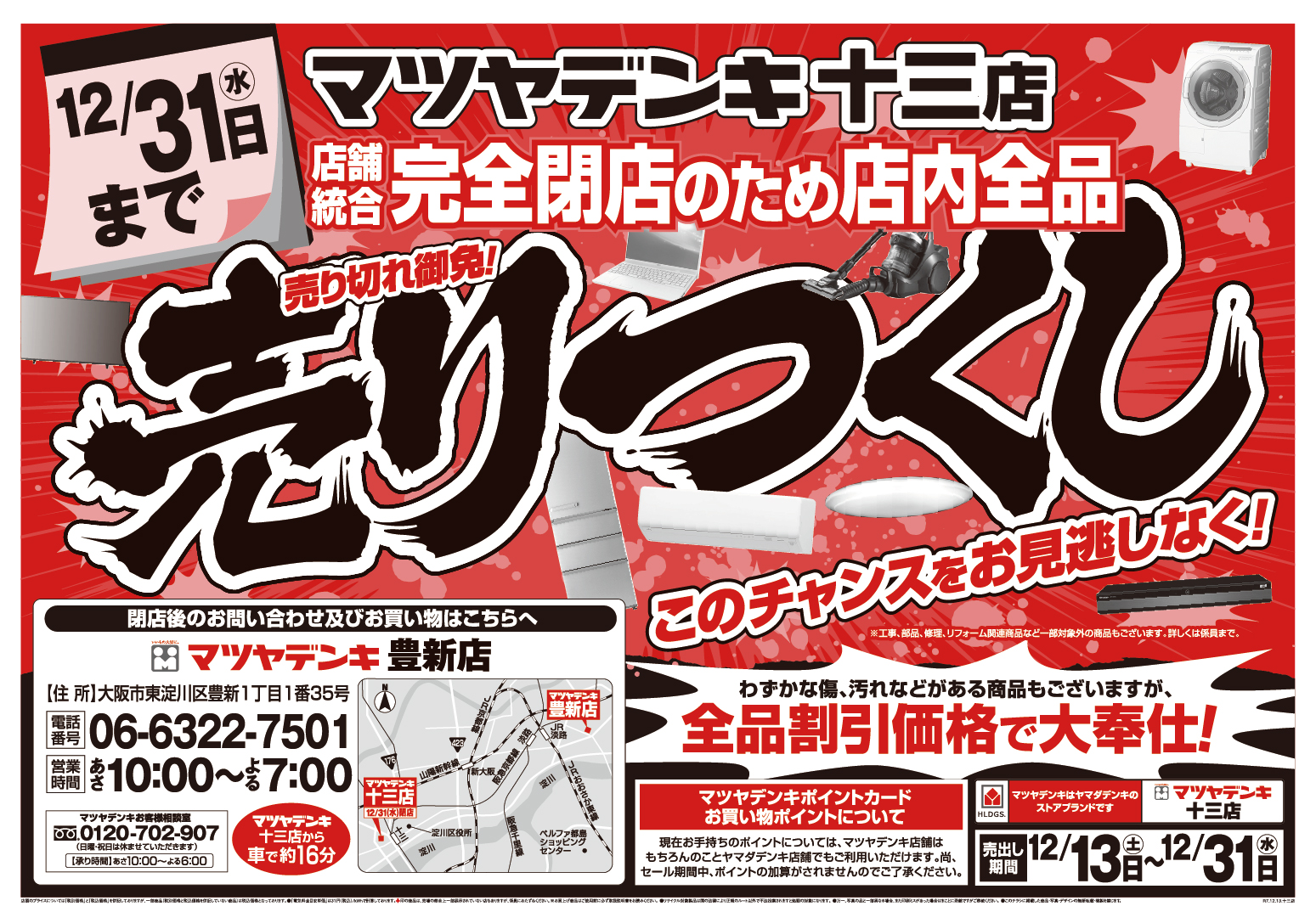 在庫一掃、早い者勝ちの「大処分市」となっていますので、この年末、何か大きな電化製品の購入を検討されている方、まずは「マツヤデンキ 十三店」さんへ足を運んでみて頂いて、お目当ての電化製品をチェックして頂ければ良いのではないかと思います!