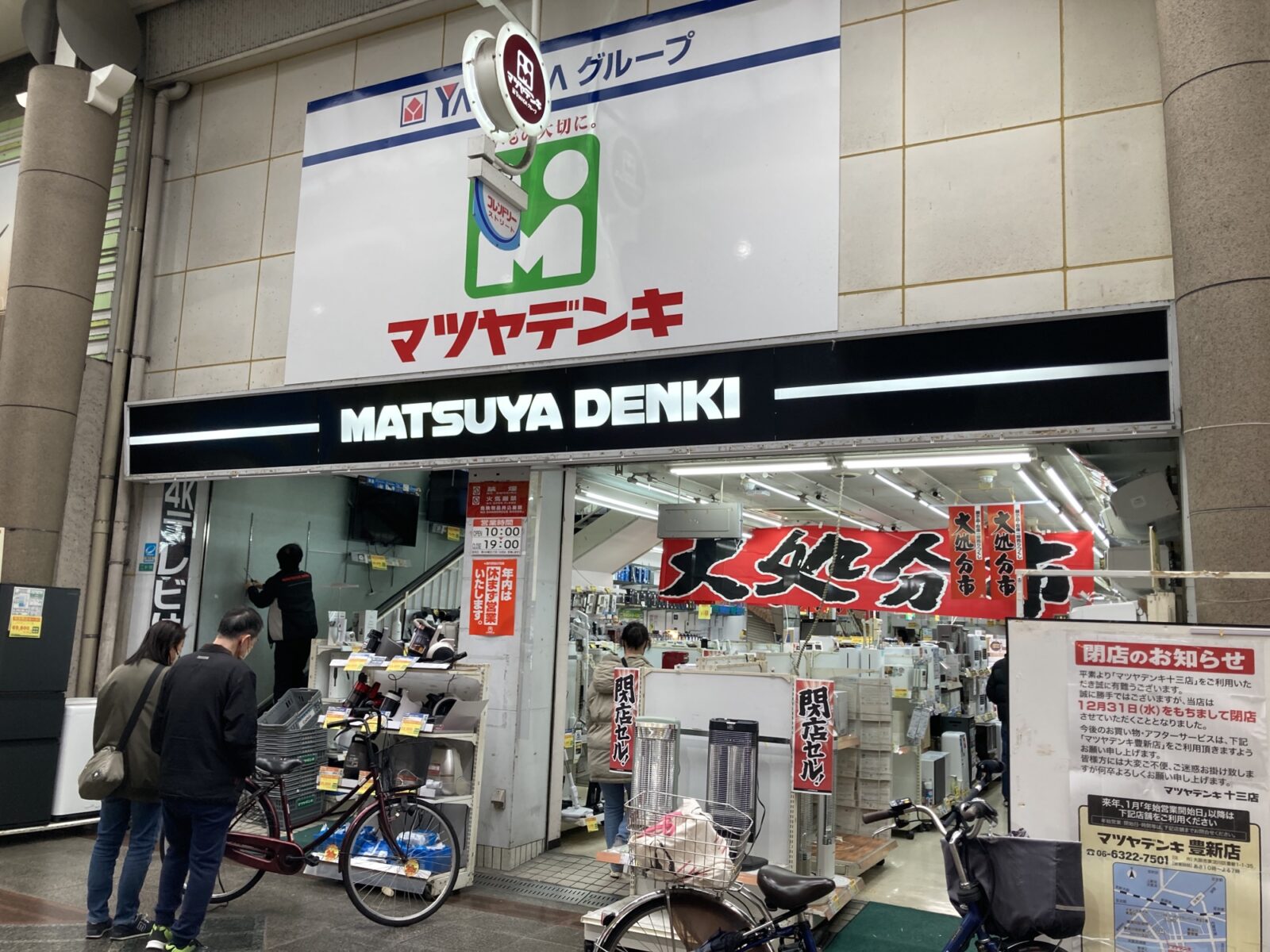店舗前&公式サイトでは、閉店を告知するアナウンスと、今後のアフターサービスに関しては「マツヤデンキ 豊新店」が引き継ぐ形になることがお知らせされています。「マツヤデンキ 十三店」でお買い物された家電製品等に関するアフターフォローやご相談に関しては、少し離れた店舗にはなりますが、淀川区豊新1丁目にある「マツヤデンキ 豊新店」さんのほうで引き続き対応されます。つまりは現在実施されている閉店セール「大処分市」で何か高価な電化製品を購入した場合においても、アフターフォローはバッチリ対応可能となっていますのでご安心くださいませ!