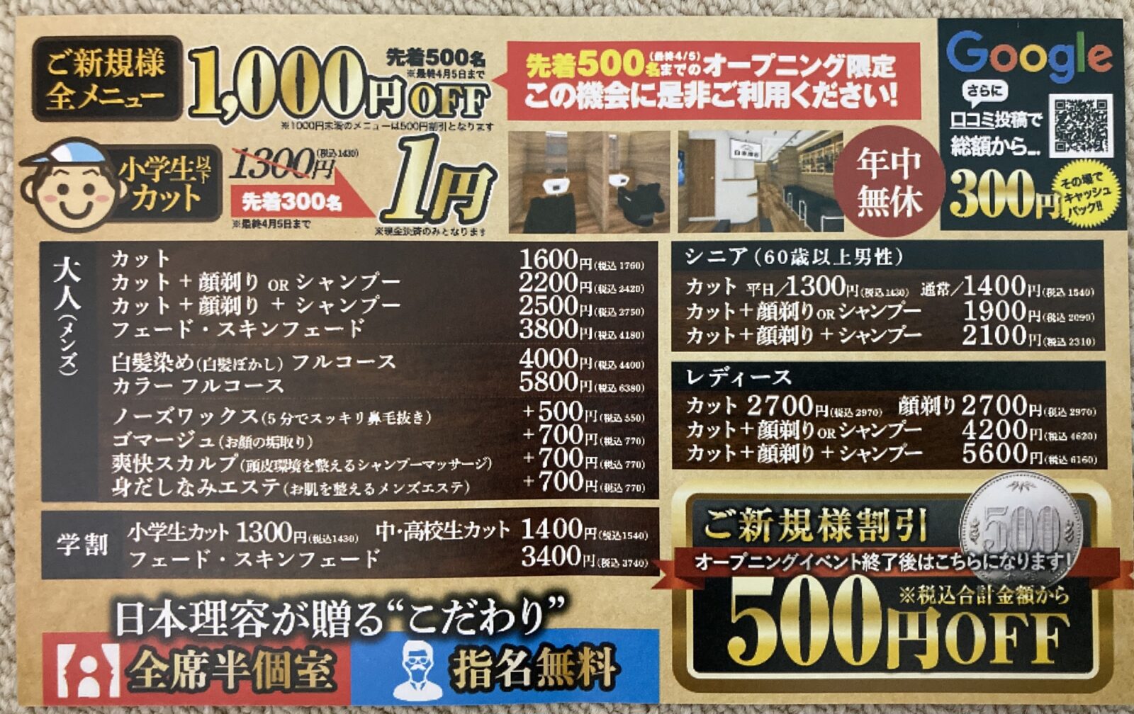 先着500名様を限定に、全メニュー1000円OFF!小学生以下のお子様に関しては、先着300名様カット料金1円という超絶スペシャルお得なオープニングキャンペーンを実施されています(~4月5日(日)迄を予定)。更にgoogleへのクチコミ投稿で、総額から300円キャッシュバックされるとのことなので、お試し利用としては相当お安くサービスを利用できるのではないでしょうか。尚、キャンペーン終了後も、ご新規様割引500円OFFが行われる様ですので、とりあえずお試しで行ってみるには、いつ行ってもお得な感じなのではないでしょうか。