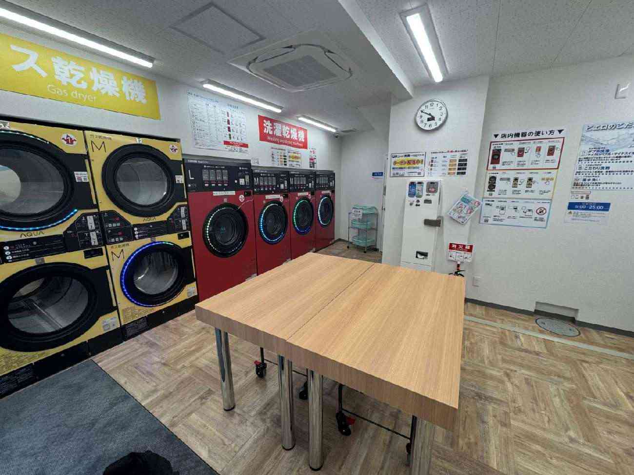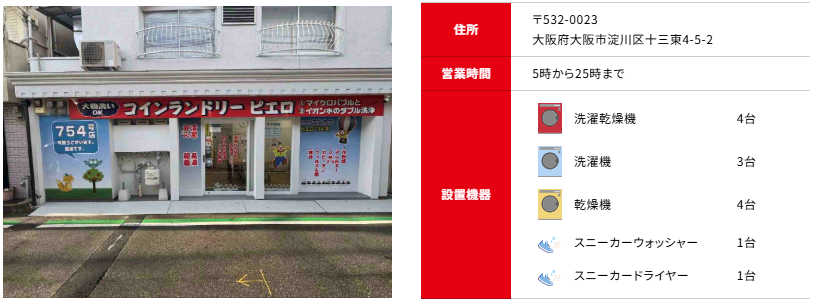 「ピエロ 754号 十三東店」さんは、大きめの店内に乾燥機付き洗濯機4台、洗濯機3台、乾燥機4台、スニーカーウォッシャーとスニーカードライヤーが各1台と、充実機器のコインランドリーになっています!
