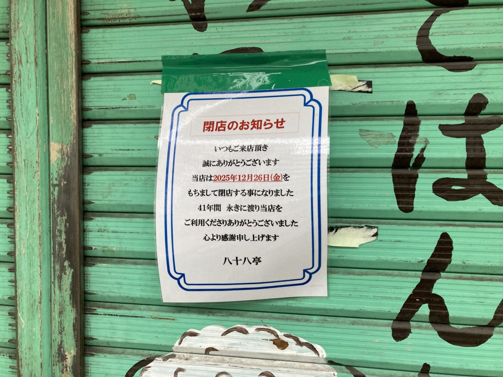 木川西2丁目、淀川通り沿いの定食屋「八十八亭(やそはちてい)」さんが2025年12月26日(金)の営業をもって閉店されています。店舗前には閉店をアナウンスするフライヤーが掲示されています。