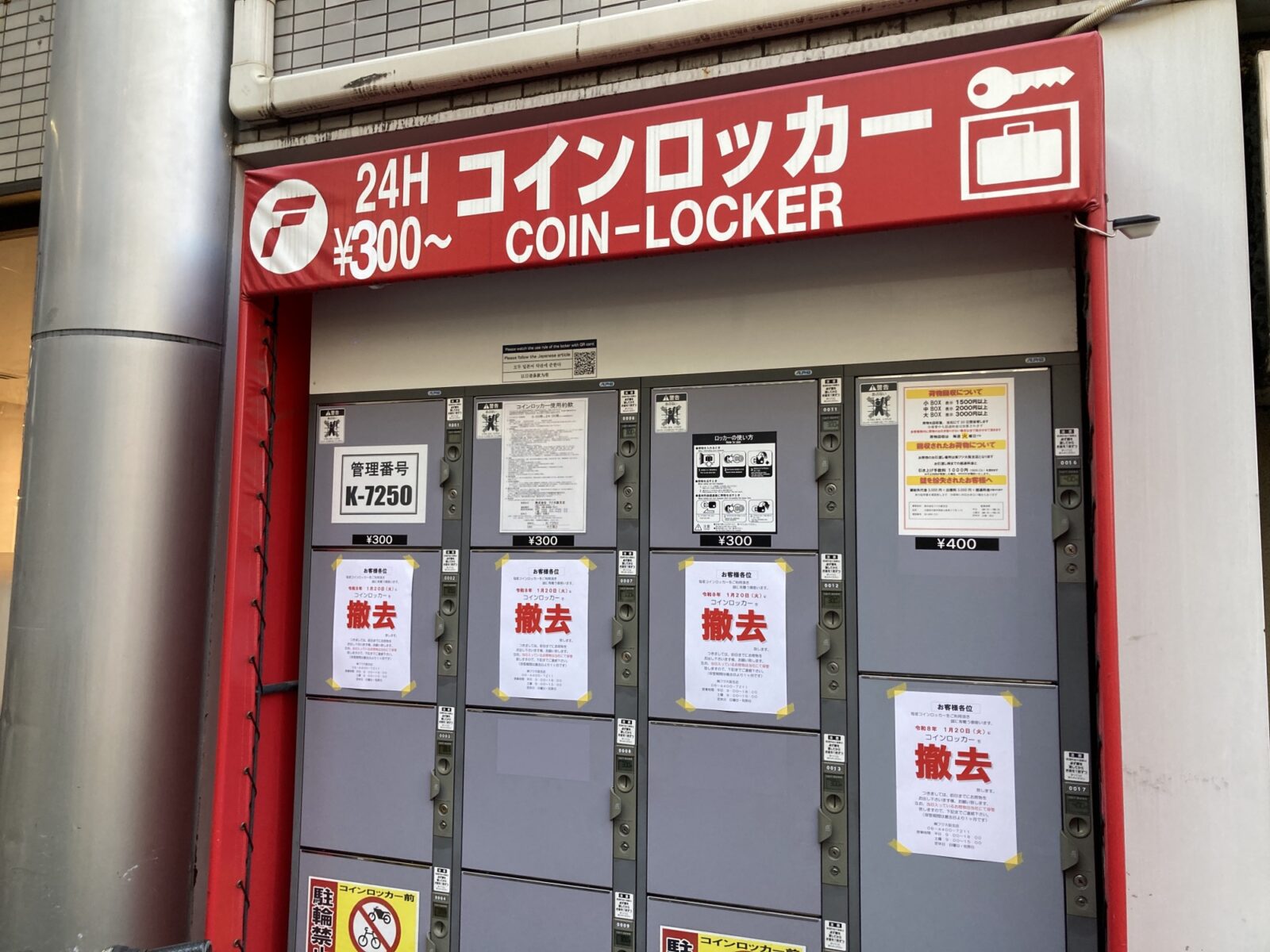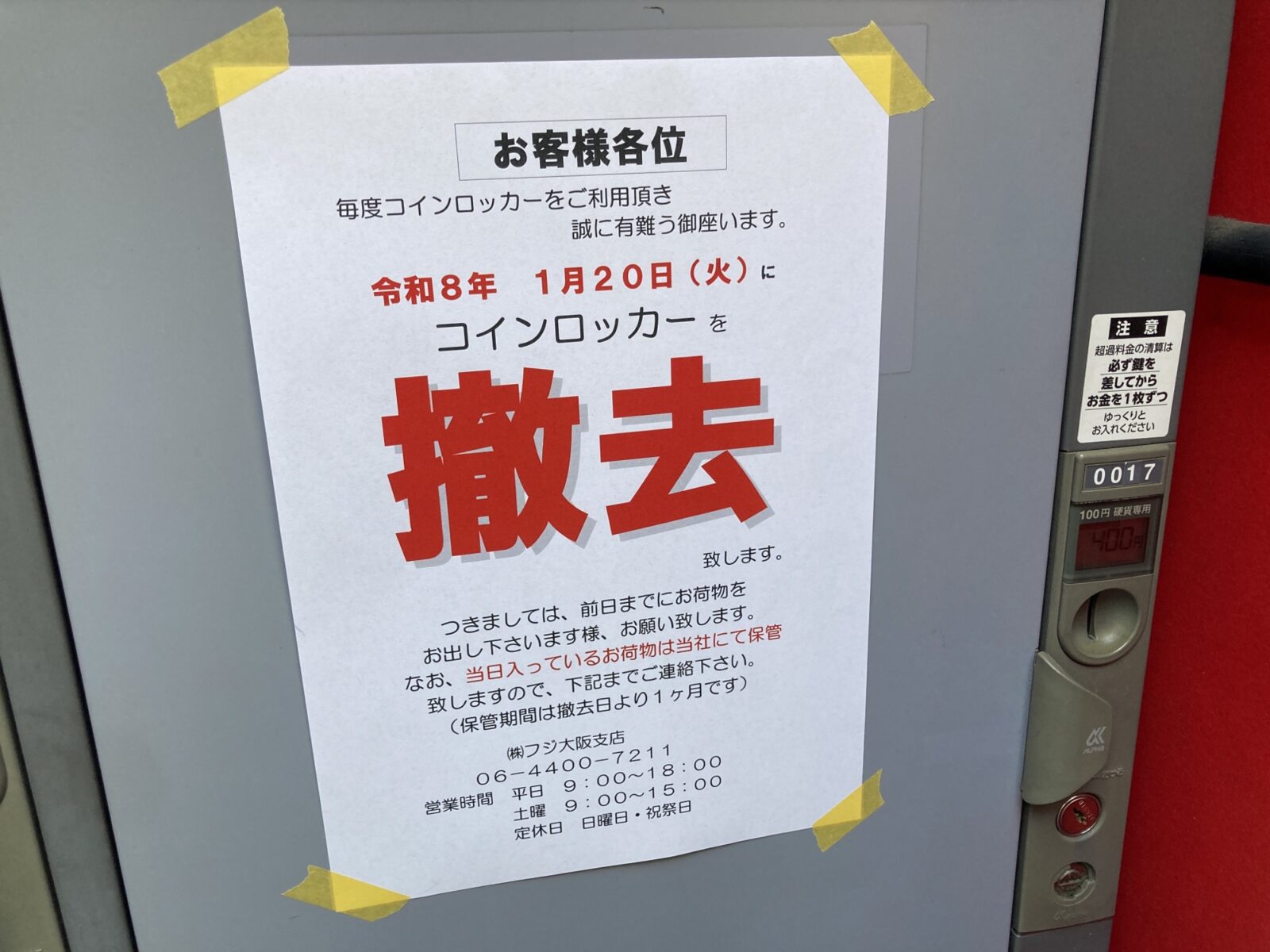 コインロッカーには撤去を行うこと、荷物は前日迄に出してほしいこと、当日入っている荷物に関しては管理会社の(株)フジ大阪支店さんにて1ヵ月保管する旨が記載されています。