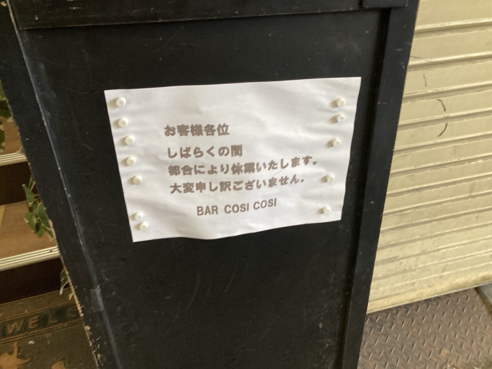 十三東駅前商店街のアーケード内にあるBAR「BAR COSI COSI(バーコズィコズィ)」が休業されているようです。