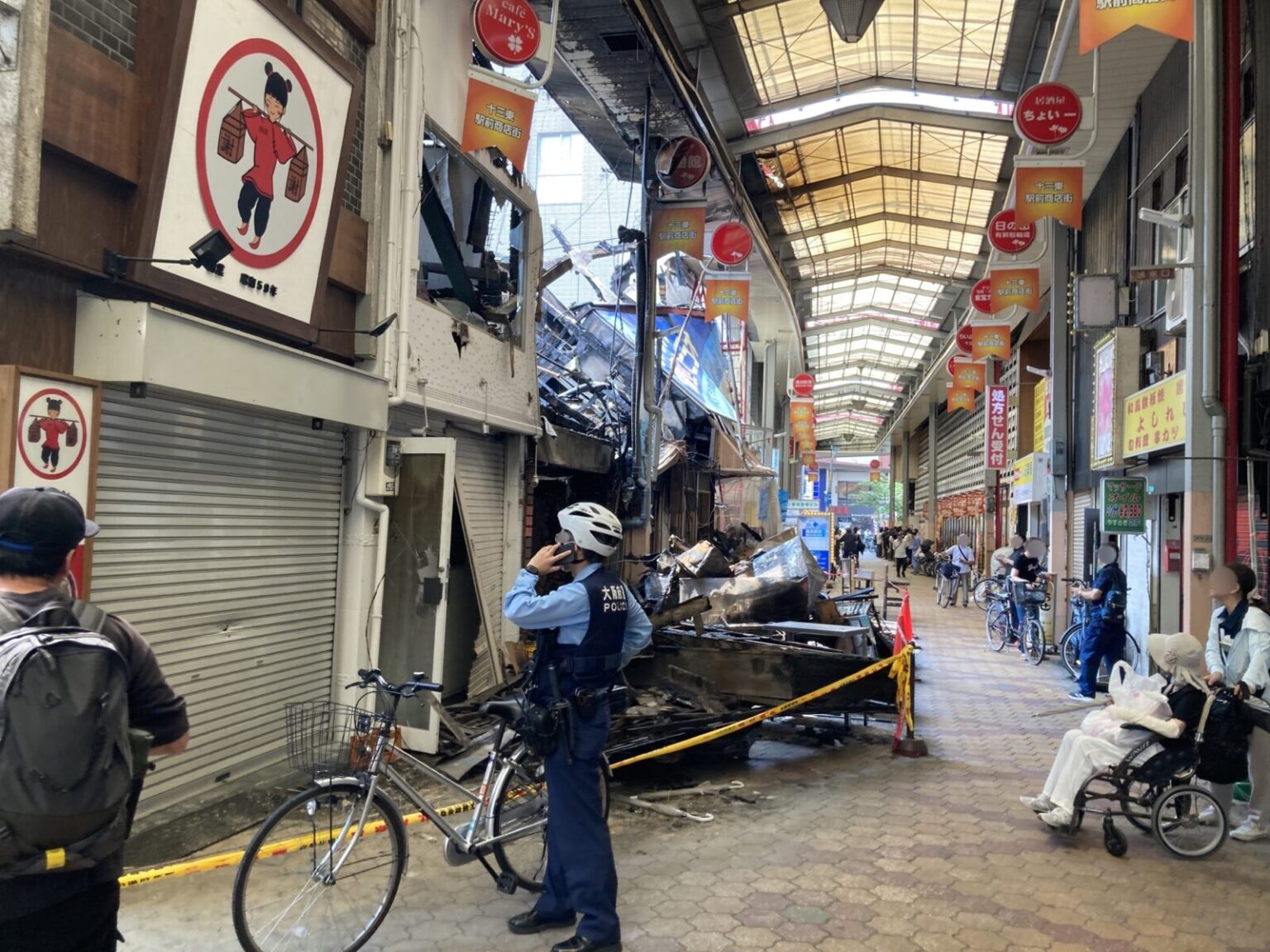 火災後2日程は全面通行止めになっていましたが、その後一部のガレキが「十三東駅前商店街」のアーケード内道路を一部遮る形になりながらも通行止めは解除、そこから繋がる「十三東小路」と、「十三戎小路」の通行止めを除いては、通行ができる様になりました。