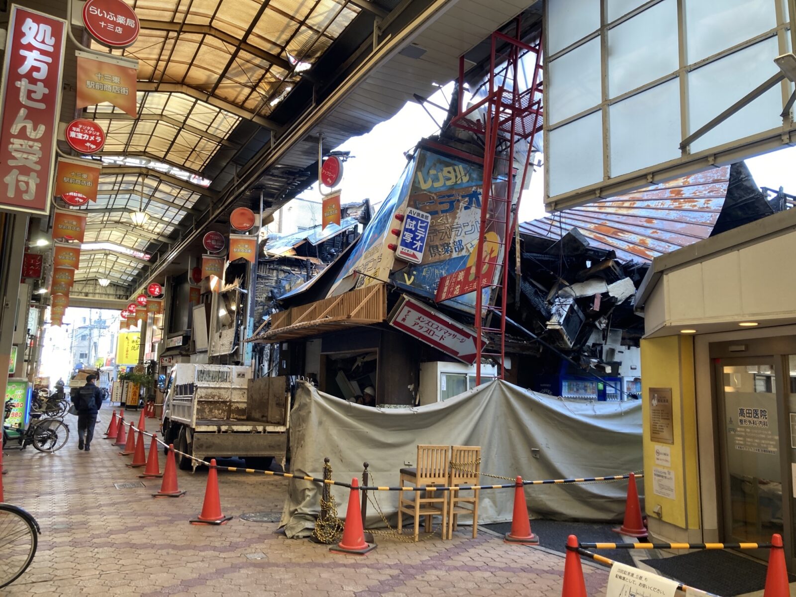 2025月7月6日(日)早朝5時頃、十三駅東口改札側のアーケード「十三東駅前商店街」にて数件の店舗が全焼する大規模な火事が発生、この火災により「十三東駅前商店街」と、その商店街に交わる形で伸びていた「十三戎小路」、「十三東小路」にあった10店舗、約450平方メートルが焼けました。