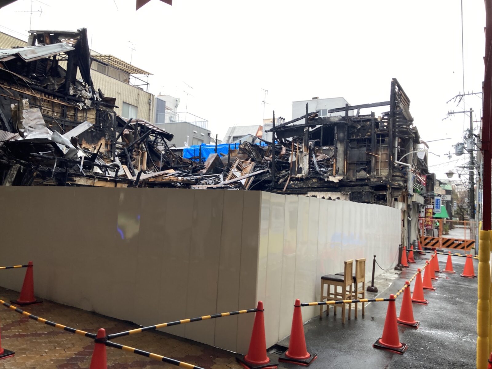 ガレキの撤去は主に「十三東駅前商店街」の道路にはみ出していた木材や燃えてしまった店舗の機材など。「十三戎小路」の道路を塞いでいた多くのガレキも撤去され、火災跡地を囲うようにバリケードが設置されました。