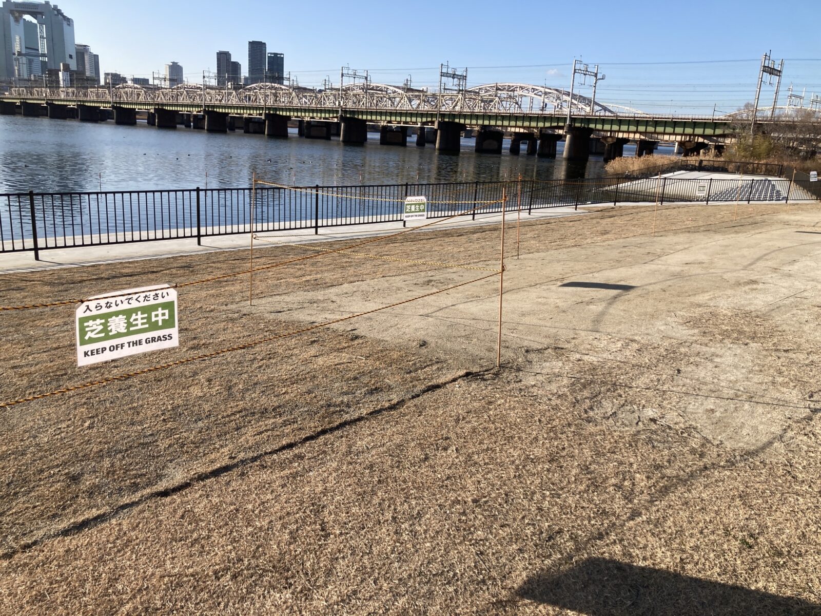 付近の芝生は現在緑を蓄えるために養生されている等、今後更にこのエリアが楽しい&美しいスポットになる様に、準備が進められています。最近ようやく開業に向けてのインフラ設備工事がスタートした、河川敷堤防沿いの屋台村「淀川つつみ市 ミナモ十三」のほうも合わせて、この一帯はこれからどんどん開発が進んでいくのではないかと思われますので、こちらも是非楽しみに気にかけていただければと思います!