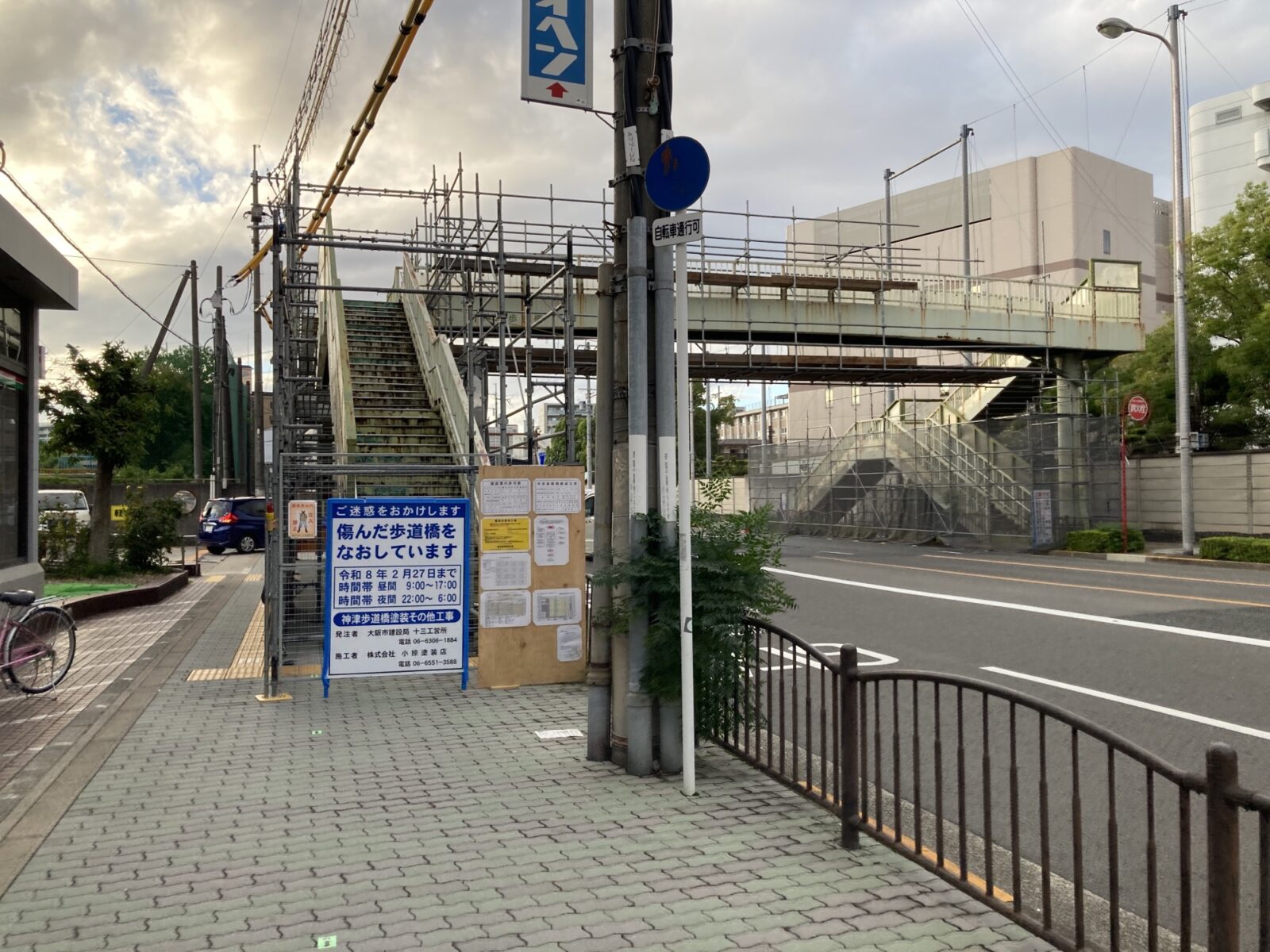 十三元今里2丁目、十三筋沿いの淀川郵便局前にある「神津歩道橋」が修繕工事のため、現在利用することができなくなっている様です。