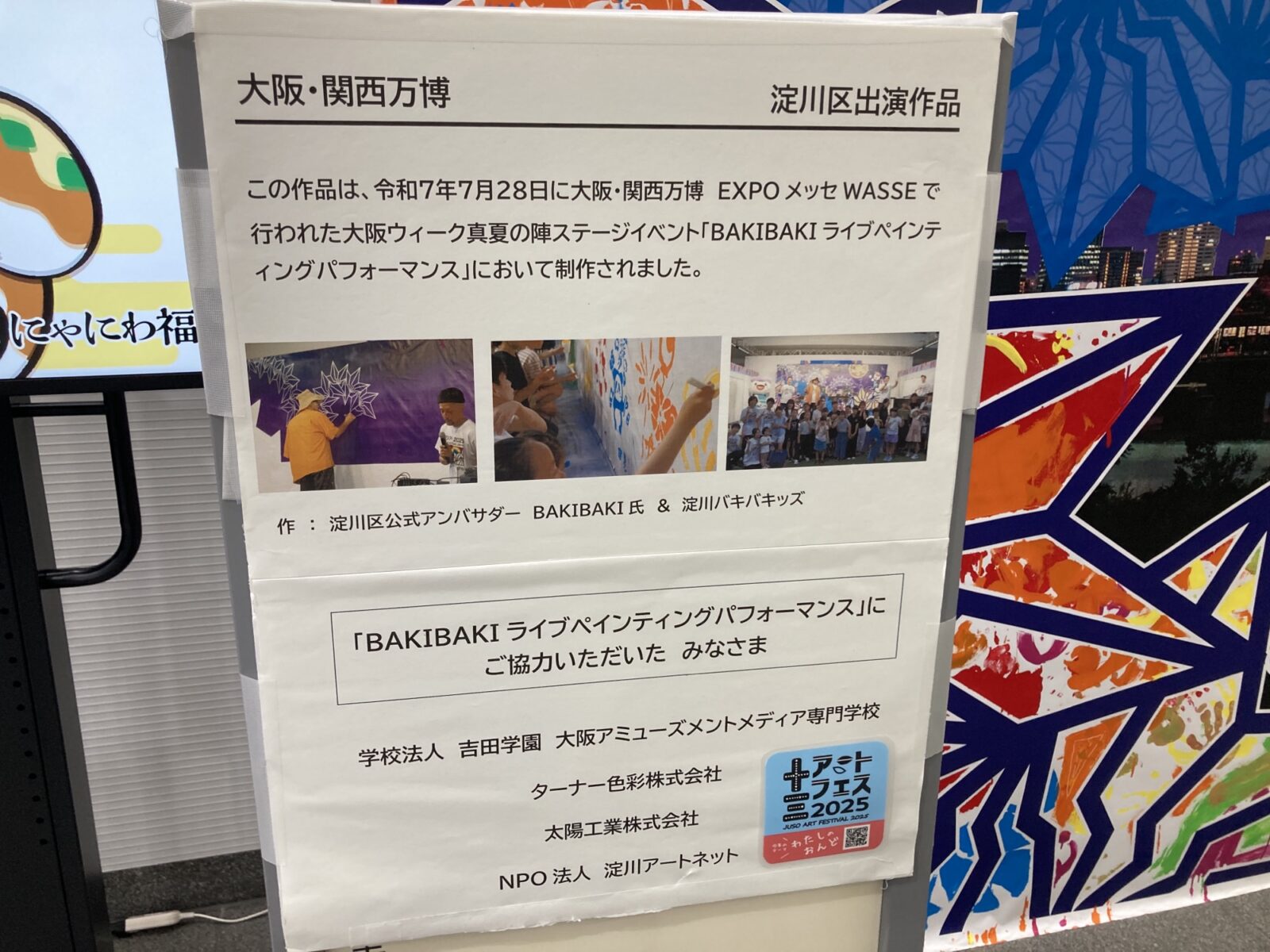 淀川区としては、2025年7月28日(月)、万博会場EXPOメッセにて「ライブペインティング」を開催。淀壁ですっかりおなじみの我らが十三を代表するアーティスト「BAKIBAKI」氏と、区内の子どもたちで、淀川の風景を“壁画”に描くライブ企画が実施されました。