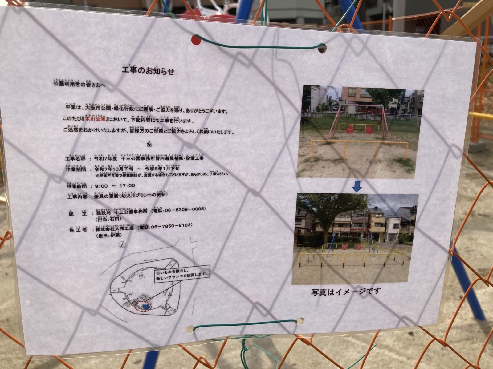 木川西3丁目にあるみんなの憩い場「木川公園」にある「幼児用ブランコ」が、2026年1月下旬に新しくなるようです。