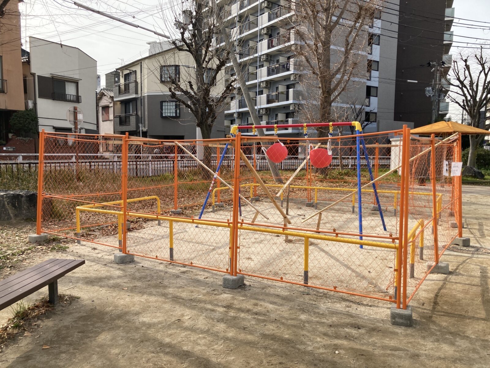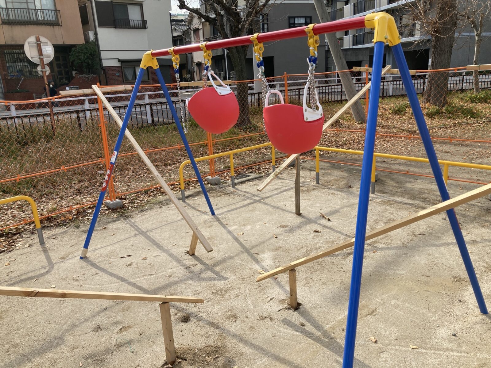 これまであった古いブランコを撤去し、新たなブランコが設置されるそうで、この写真を撮影した日は、間もなく入替、ブランコの開放が行われる直前…といった様子でした。